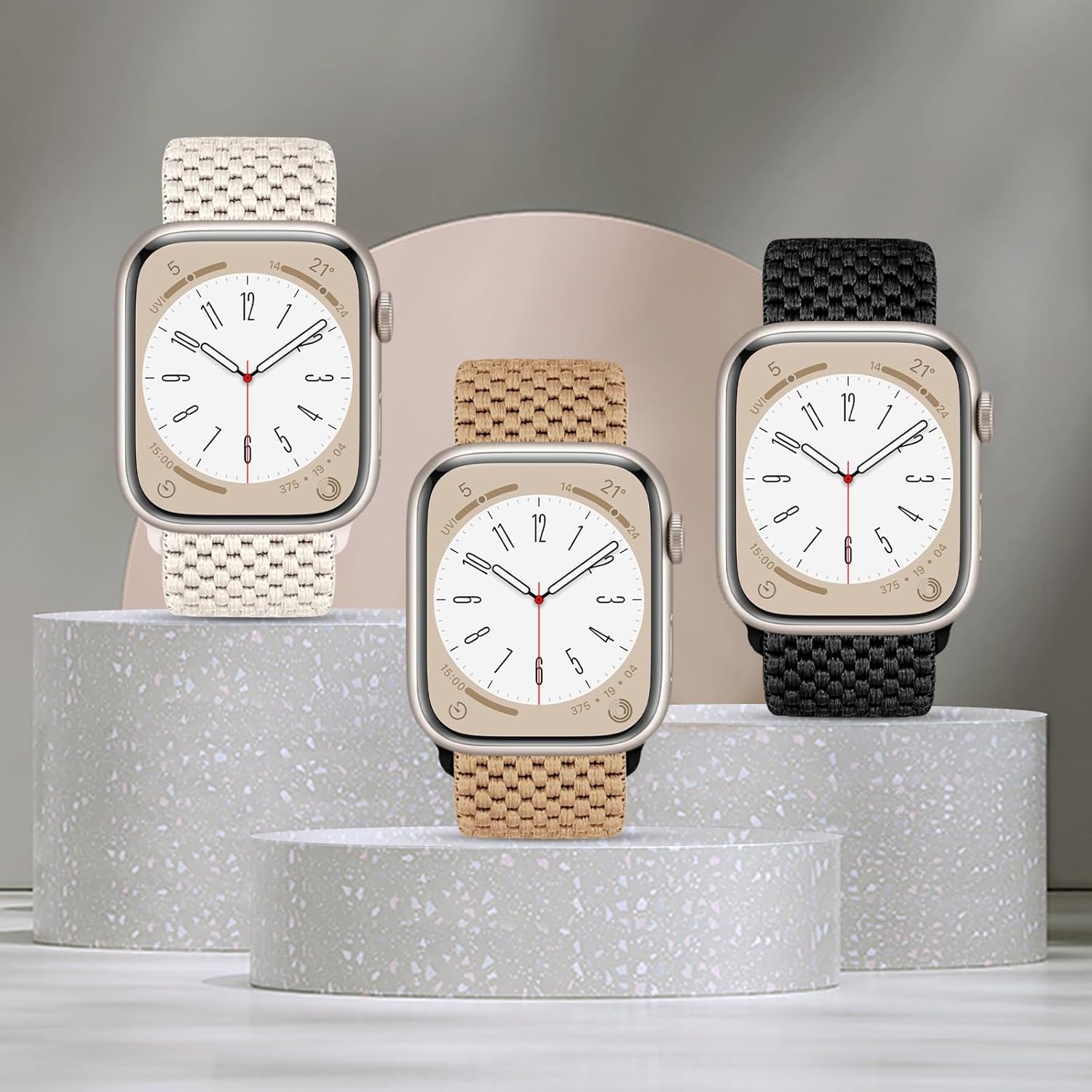 8 reviews for 3 Pack Stretchy Nylon Band Compatible with Apple Watch Band 38mm 40mm 41mm 42mm Women Men, Adjustable Sport Solo Loop Strap for iWatch Series Ultra SE 10/9/8/7/6/5/4/3/2/1, Starlight/Brown/Black