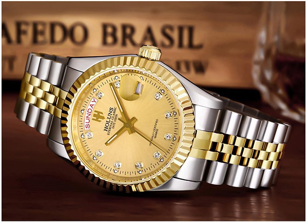 This 41mm men’s gold plated stainless steel waterproof quartz watch blends timeless elegance with everyday reliability, making it a smart choice for men who value both style and function. Designed for seamless integration into daily life, it features a classic round case and a matching stainless steel bracelet that balances sophistication with durability. The watch includes dual date and day-of-the-week displays, offering practical timekeeping support for busy schedules. Powered by precise quartz movement and protected by a mineral crystal, it delivers consistent accuracy while resisting scratches and minor impacts. Whether you’re dressing for the office, attending a formal event, or enjoying a weekend outing, this timepiece maintains a refined presence without compromising on resilience.