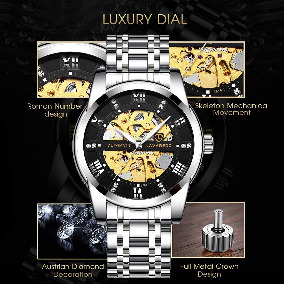 - Skeleton Dial with 3D Design: The open-heart dial showcases the automatic movement in motion, enhanced with Austria diamond decorations and raised Roman numeral hour markers for a premium, multidimensional look that captures light and attention.