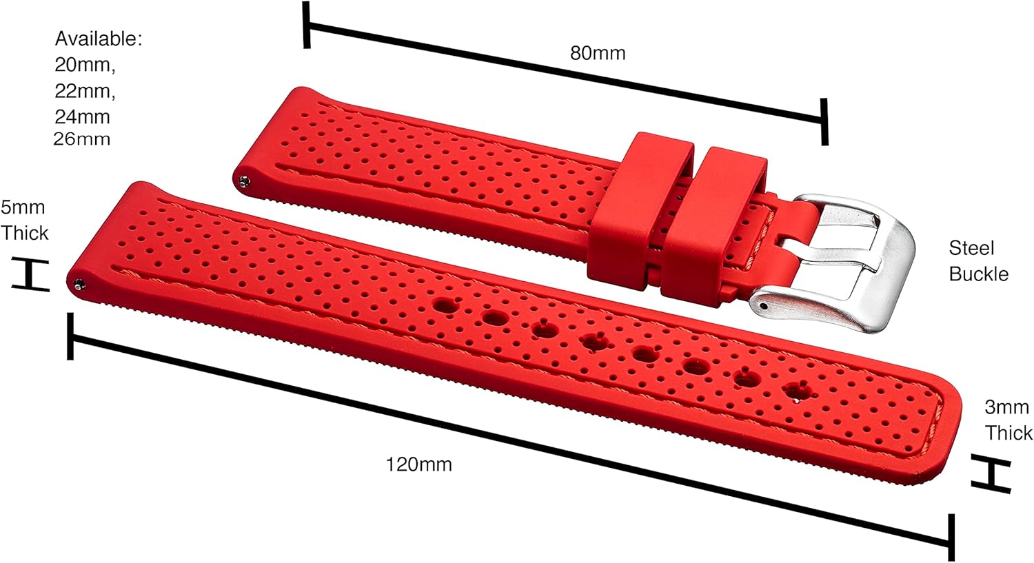 This soft & smooth stitched silicone sporty watch band is a perfect combination of comfort, flexibility and durability. This band will not easily crack, smell or get harder in any rough sports or other activity. This premium quality silicone watch band has soft and smooth finish. It is waterproof and Hypo-Allergenic. Additional Information: Our Silicone Bands are manufactured with superior grade Silicone with high tensile and strength and can endure any extreme environment and will not easily deform or crack. They are extremely soft and comfortable. They have plenty of holes available to adjust the length and fit wrist.