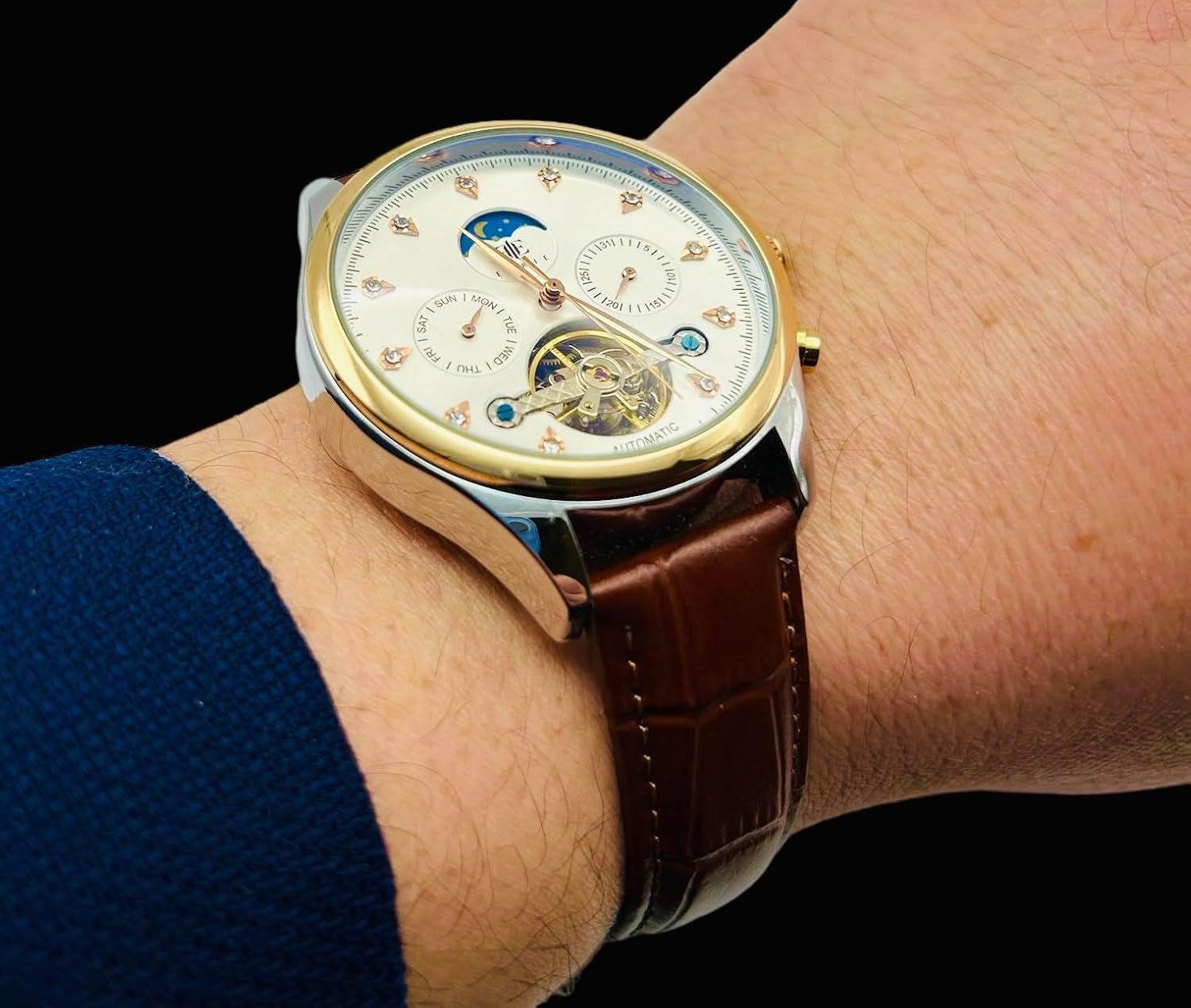 This automatic watch is designed for daily wear, offering both functionality and style across a range of settings. Its elegant design makes it suitable for business meetings, formal dinners, or weekend outings, seamlessly transitioning from professional to personal environments. The leather strap ensures comfort throughout the day, while the gold case adds a touch of refinement that pairs well with suits, blazers, or smart-casual outfits. As a self-winding watch, it’s perfect for individuals who prefer low-maintenance accessories that still deliver precision and craftsmanship. Whether as a personal upgrade or a thoughtful gift, this timepiece suits men who appreciate quality, tradition, and understated luxury. It’s especially well-suited for those who value mechanical artistry and timeless design over digital trends.