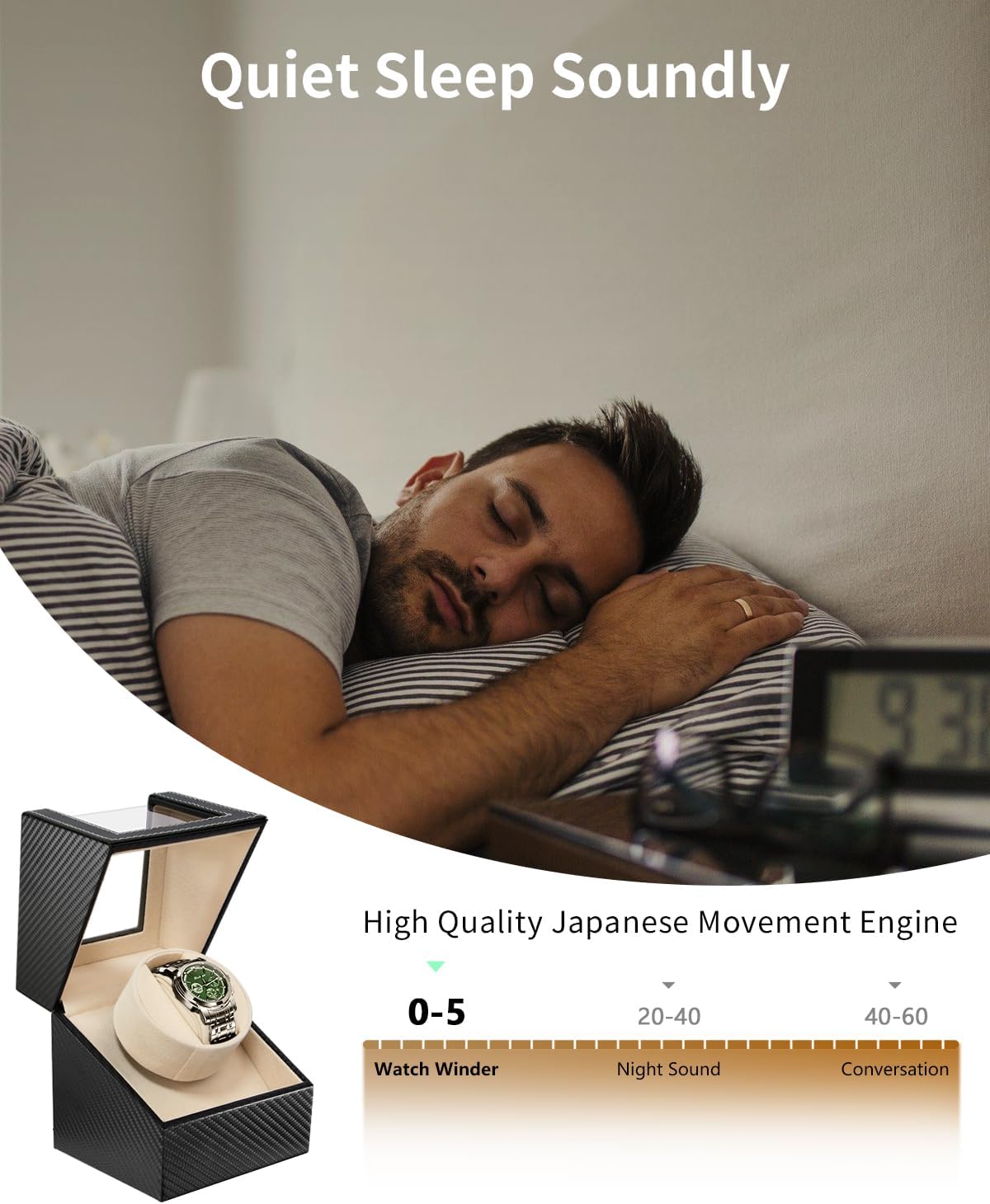 Exceptional Craftsmanship: Our automatic watch winder is meticulously handmade from premium materials like carbon fiber leather, MDF, and clear acrylic glass for durability and a luxurious touch. It ensures perfect protection for your watch