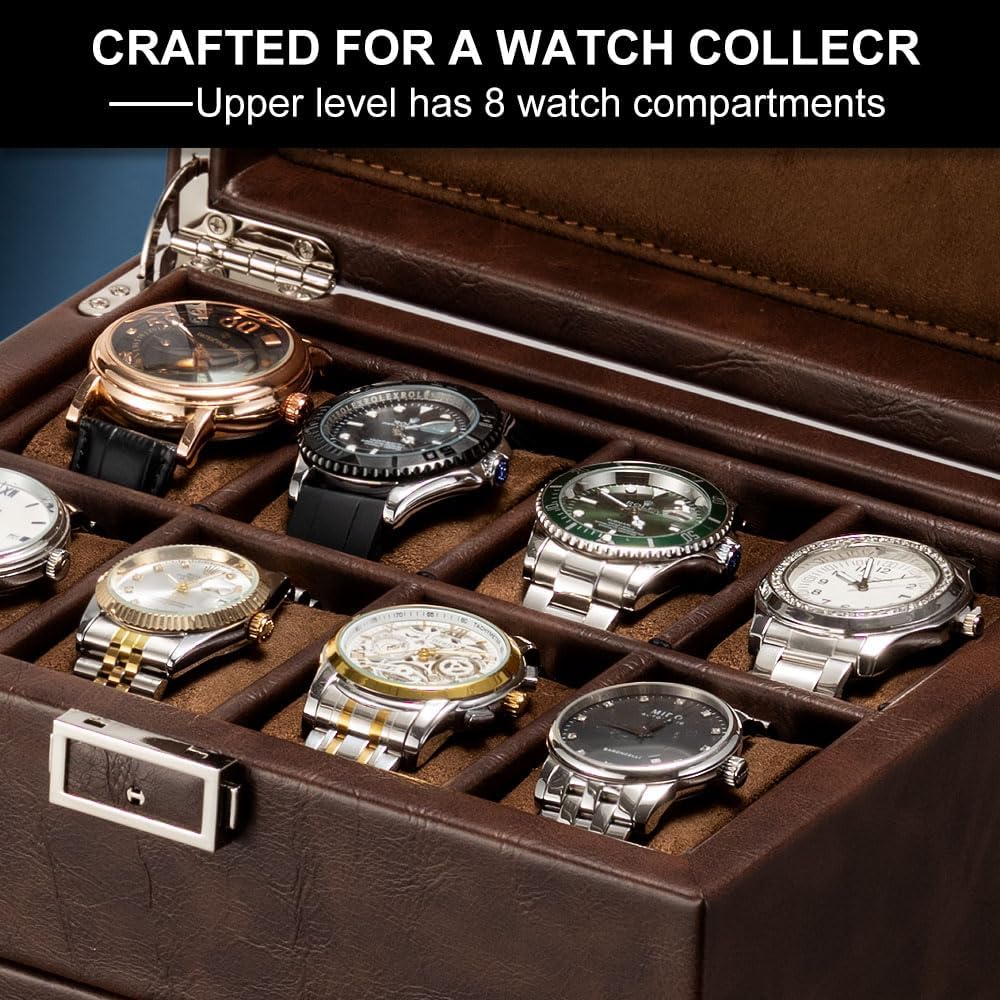 - Product Dimensions: 7.9 x 9.8 x 8.5 inches – Compact yet spacious design that fits comfortably on a dresser, nightstand, or in a closet while providing ample room for two watches and eight additional storage slots.