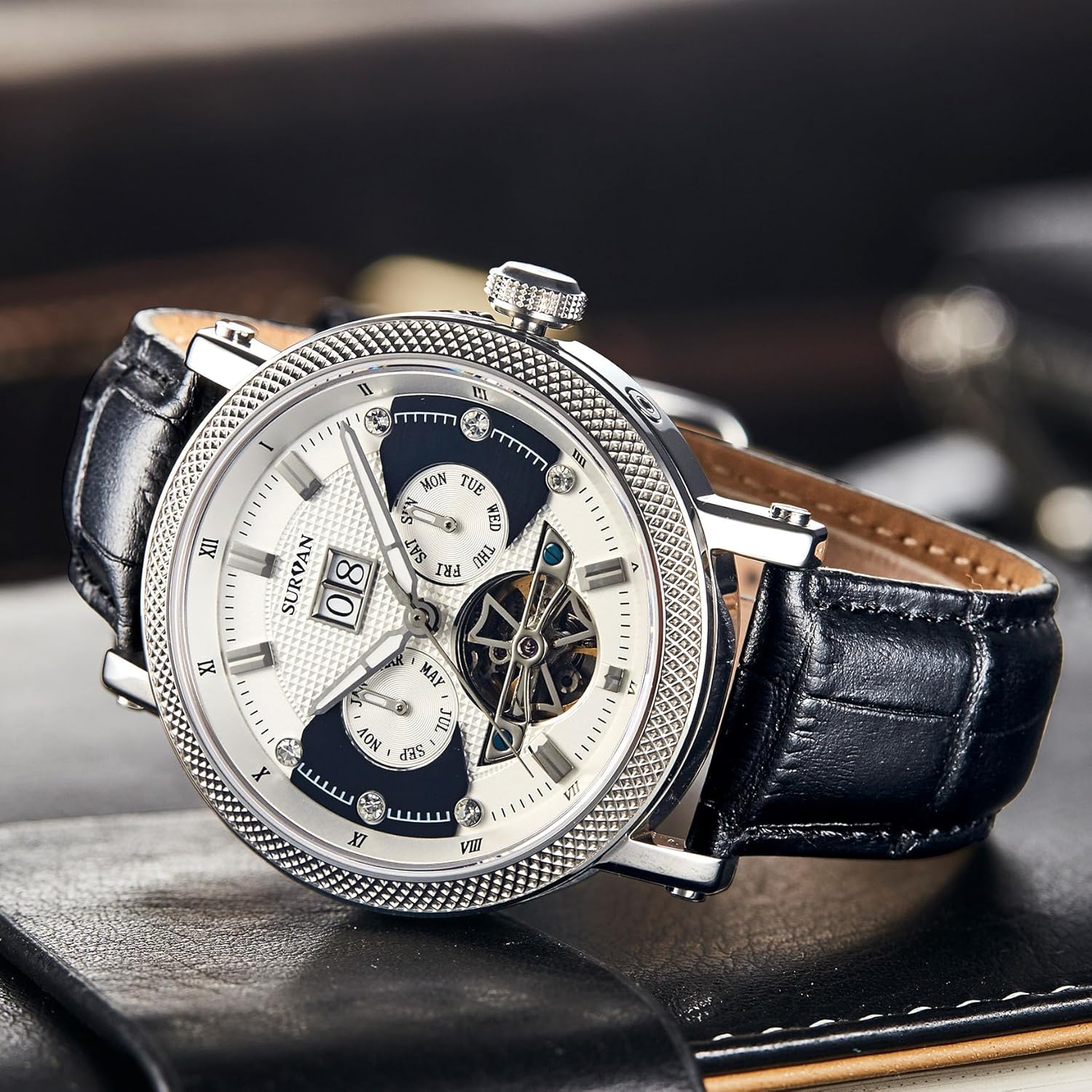 This automatic watch is built for men who appreciate the fusion of tradition and innovation. Its self-winding mechanism makes it ideal for everyday wear—simply wearing it regularly keeps it powered and accurate. The skeleton dial offers a dynamic visual experience, especially appealing to watch enthusiasts and collectors who enjoy seeing the movement in action. The sapphire crystal ensures long-term durability, while the genuine leather strap provides comfort and a timeless look that complements both casual and formal attire. The date function adds everyday practicality, helping you stay on top of your schedule without relying on a smartphone. From business meetings to weekend outings, this watch adapts to your lifestyle with ease. Its balanced design and reliable performance also make it a meaningful gift for milestones such as graduations, promotions, or anniversaries.