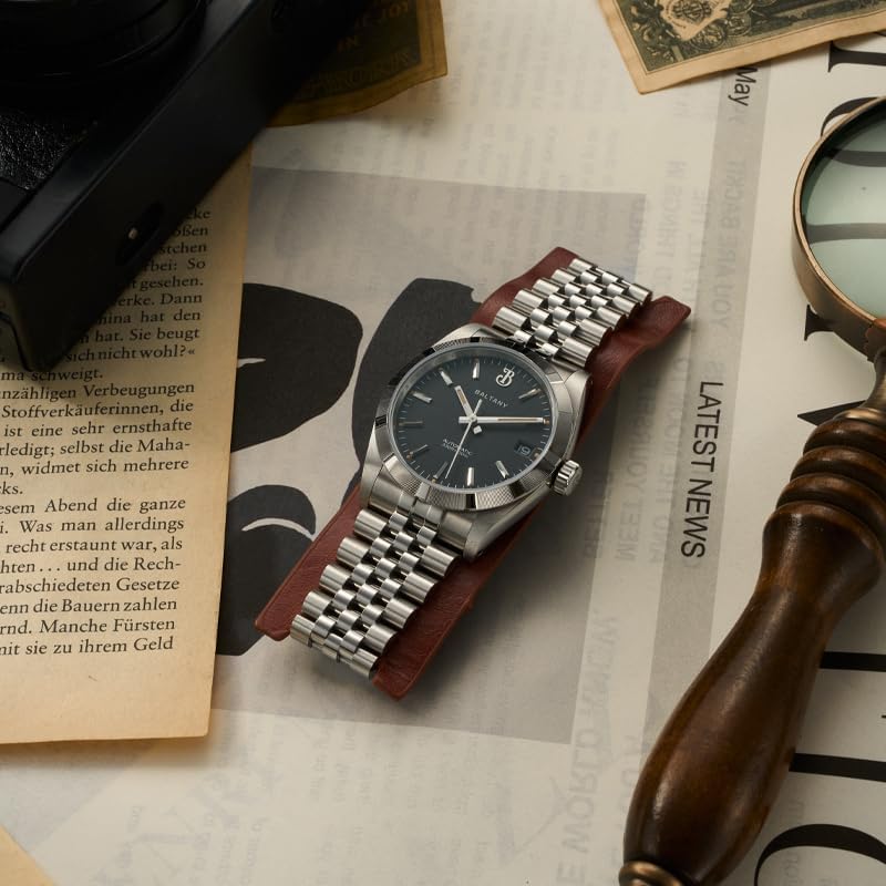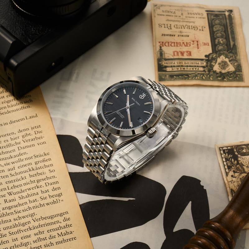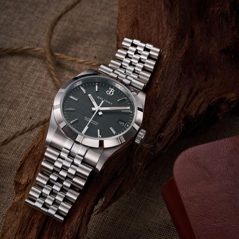 The Baltany S4102 excels as a versatile dress watch that transitions seamlessly from office settings to evening events. Its 36mm case diameter offers a classic, understated presence on the wrist, making it ideal for those who prefer a more traditional watch size. The linen dial and engine-turned bezel give it a vintage-inspired look, while the sapphire crystal and automatic movement ensure long-term reliability. With 100M water resistance, it’s suitable for everyday exposure to water, including handwashing and swimming. The 20mm bracelet is compatible with a wide range of aftermarket straps, allowing for customization based on personal style. Weighing approximately 132 grams, it provides a solid, substantial feel without being overly heavy. This watch is well-suited for men seeking a dependable, stylish timepiece with mechanical heritage and modern durability.