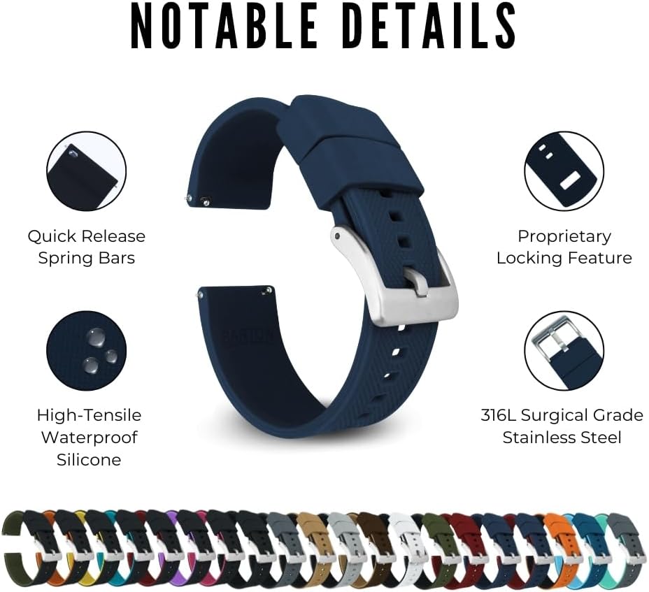 VERSATILE STYLE FOR EVERY OCCASION Barton’s Elite Silicone Watch Bands are our best-selling watch straps in over 100+ countries. The elite silicone is available in a wide range of colors, multiple widths (18mm, 19mm, 20mm, 21mm, 22mm, 23mm, 24mm) and multiple to complement any watch style. Compatible with traditional watches, smartwatches, analog, and digital models using quick-release spring bars.CUSTOMIZED FIT FOR EVERY WRIST Designed to fit wrists from 6.5” to 8”, Barton’s silicone bands offer a comfortable, secure fit for most wrist sizes. Precision-cut holes allow for individualized adjustment, and quick-release spring bars make swapping bands effortless. Just slide the lever, and your new band is in place in seconds.PREMIUM SILICONE FOR MAXIMUM COMFORT Crafted from high-quality, durable silicone, Barton’s Elite Watch Bands are soft, flexible, and ready for both active and everyday wear. The premium silicone material is not only comfortable but also built to withstand wear, providing long-lasting style and reliability.