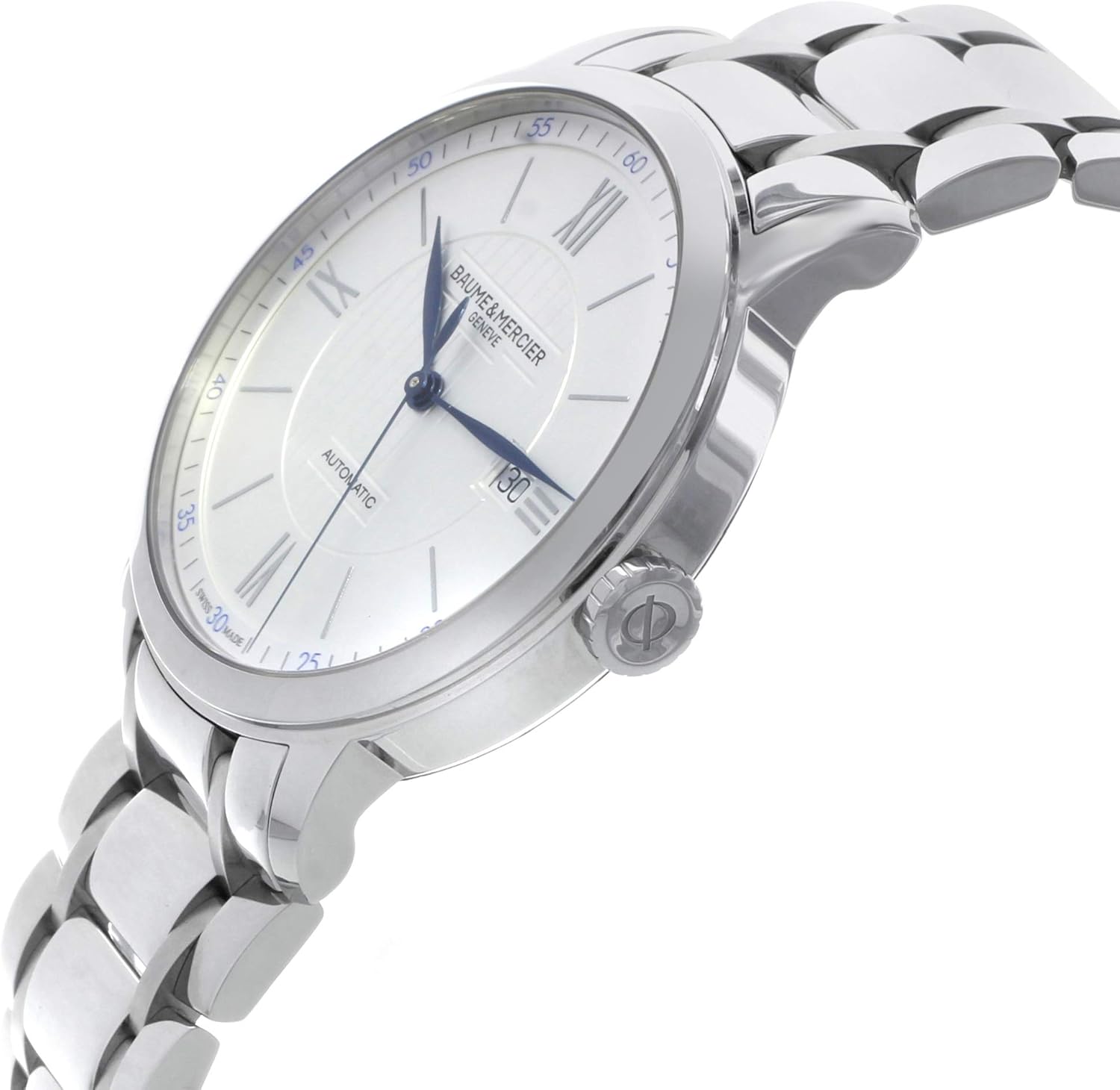 The Baume et Mercier Classima Automatic Silver Dial Men’s Watch MOA10334 is a masterclass in refined horology, blending Swiss precision with understated elegance. Designed for the discerning gentleman who appreciates both aesthetic simplicity and mechanical sophistication, this timepiece stands as an entry point into luxury watchmaking without compromising on quality or heritage. The watch features a lustrous silver dial accented by striking blue leaf-style hands, creating a timeless contrast that enhances legibility while exuding classic refinement. Its 42 mm case—just over 4 centimeters in diameter—and slim 8.95 mm profile ensure it sits elegantly on the wrist without appearing bulky, making it suitable for both formal occasions and everyday wear. Crafted from polished silver-tone stainless steel, the case and matching bracelet offer durability, resistance to tarnishing, and a sleek appearance that complements a wide range of styles.
