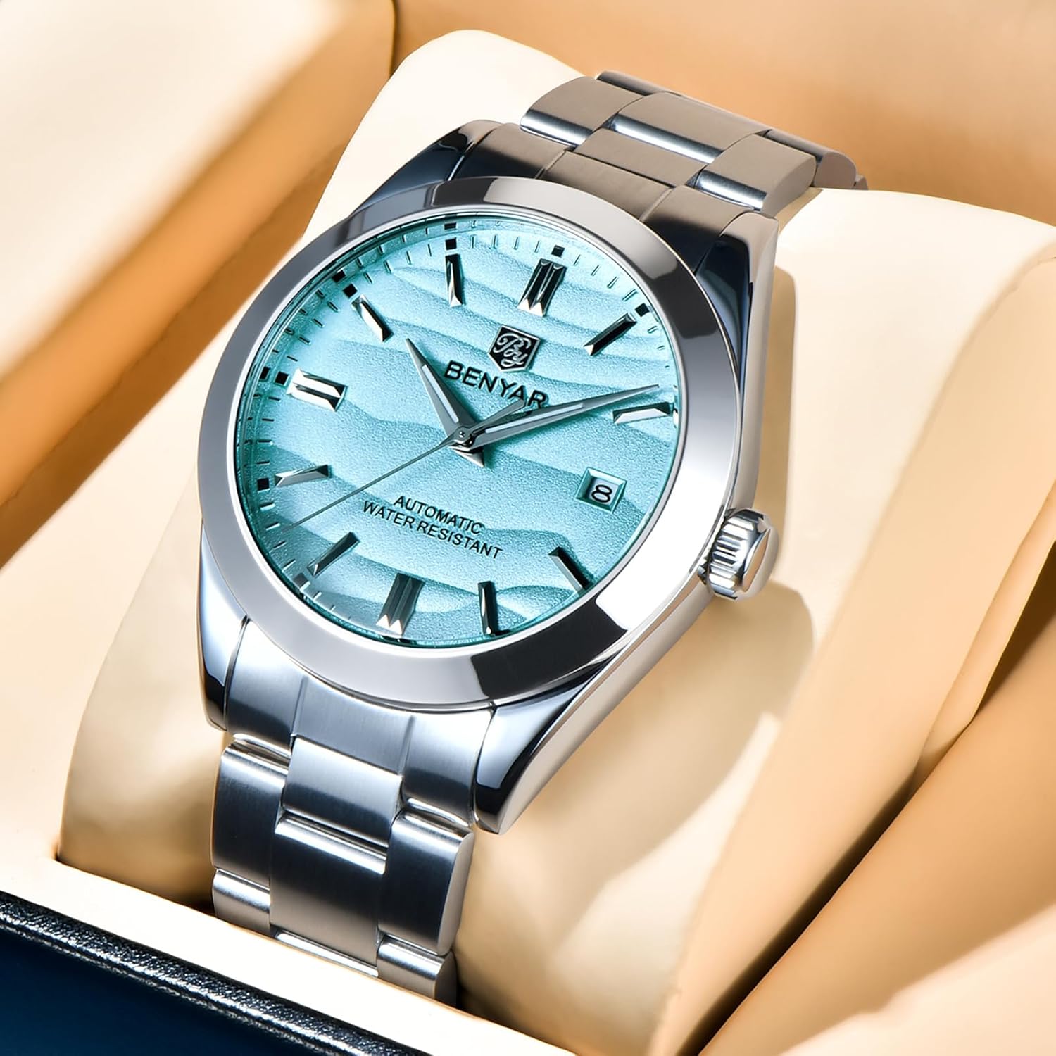 Please allow for a manual measurement error of 0.1–0.2 cm. The actual color of the watch may vary slightly due to lighting and monitor settings. While rated for 50 meters of water resistance, the watch is not suitable for bathing, swimming, or exposure to high-pressure water. To maintain accuracy, avoid adjusting the date or time between 9:00 p.m. and 3:00 a.m., as the internal calendar mechanism is active during this period. For models with screw-down crowns, always unscrew counterclockwise before adjusting, then re-tighten clockwise to prevent water ingress. Keep the watch away from strong magnetic fields, which may affect timekeeping or damage the movement. Regular cleaning with a soft cloth will help preserve the finish. If the watch is not worn for an extended period, manually wind it periodically to prevent the movement from stopping. Includes one BENYAR Men’s Automatic Watch, original watch box, instruction manual, and warranty card. For warranty details, refer to the manufacturer’s information.