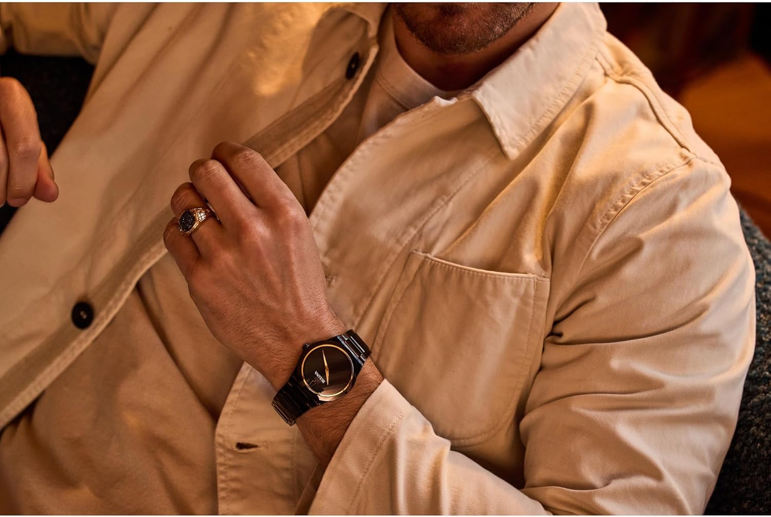 - Minimalist Black Dial with Gold-Tone Accents – The dial features no hour markers, relying instead on angular gold-tone hands for time reading. A subtle gold-tone ring encircles the dial, adding contrast and refinement without disrupting the clean aesthetic.