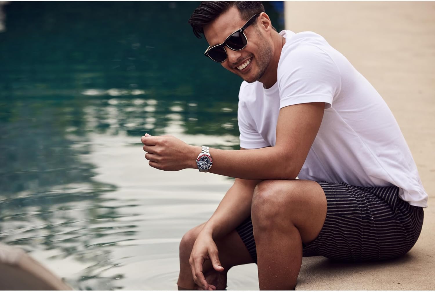 - Blue and Red Bidirectional Rotating Bezel: The 24-hour bezel allows for tracking of a second time zone or elapsed time, rotating smoothly in both directions for quick adjustments. The vibrant blue and red color scheme enhances visibility and adds a sporty, nautical flair.