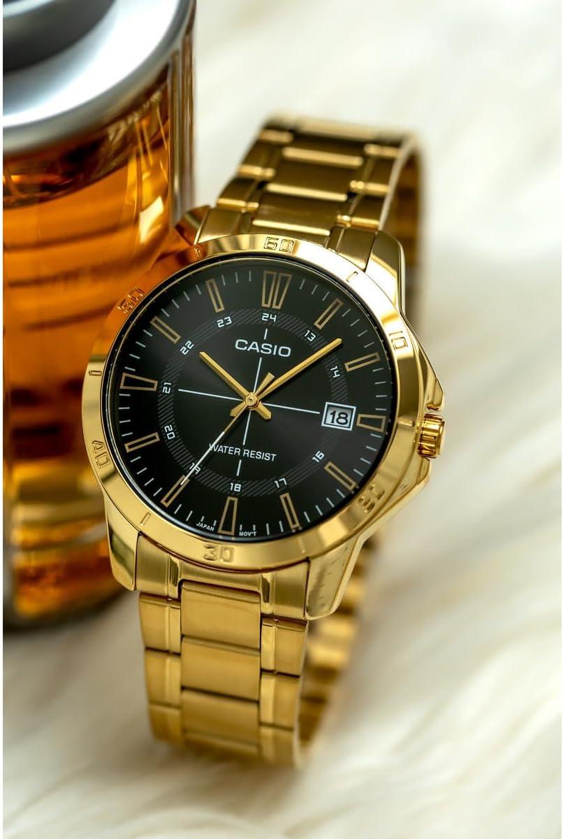 The Casio Quartz Black Dial Gold Stainless Steel Men’s Watch MTP-V004G-1CUDF delivers a refined balance of classic aesthetics and everyday reliability. Designed for the modern man who values both form and function, this analog watch features a clean black dial housed within a polished gold-tone stainless steel case. The straightforward layout—featuring hour, minute, and second hands—ensures effortless readability at a glance, while slim bar index markers provide subtle definition without clutter. A discreet date-day window at the 3 o’clock position adds practical value, helping you stay organized throughout your day. The matching gold-tone stainless steel bracelet completes the cohesive look, offering a comfortable fit that transitions smoothly from office wear to weekend outings. With water resistance built for daily life, you can wear it while washing your hands or caught in a light drizzle without concern. This is a watch that doesn’t demand attention but enhances your presence with quiet confidence.