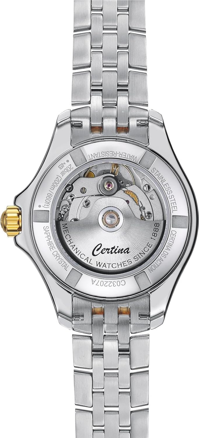 This watch is packaged in a compact box measuring 5.55 x 5.35 x 3.94 inches and weighs just 3.77 ounces, making it easy to store, transport, or gift. As a newly launched model first available on August 12, 2024, it reflects Certina’s latest advancements in women’s automatic watchmaking. The manufacturer’s warranty is available upon request—customers should contact Certina’s customer service directly to initiate a claim or obtain coverage details. While the watch is water resistant, it is not suitable for swimming, showering, or diving; prolonged exposure to water may compromise its integrity. To maintain its appearance, regular cleaning with a soft, dry cloth is recommended. For optimal care, always follow the official Certina maintenance guidelines to preserve the finish, movement, and overall longevity of the timepiece.