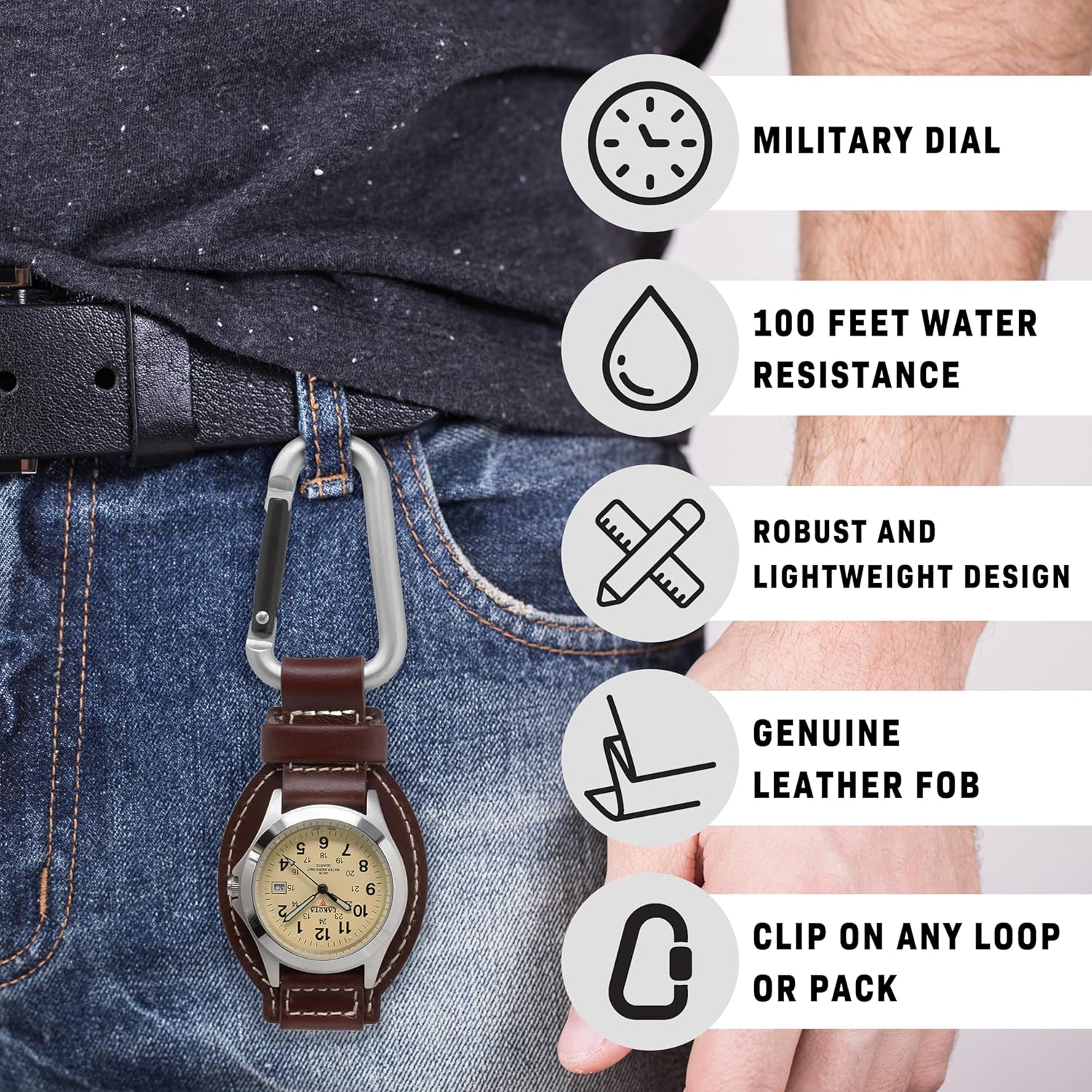 The Dakota Leather Field Clip Watch has proved itself to be exactly what I had been looking for.As I’ve grown older the feel of a watch around my wrist has become annoying. A cell phone also provides accurate time, but unlike a watch it is not ready at a glance. To attempt to solve the problem I first tried a pocket watch and it proved itself to be just another lump in the pocket and as inconvenient as a cell phone to dig out. I decided to try the Dakota Clip watch. The price was right and and it looked attractive.For the past year the Dakota watch has hung from a pants belt loop in front of my pocket. It is quickly available at a glance – even while driving. Friends ask where I got it and offer compliments. The watch is lightweight, holds up to wear and tear, keeps good time, does not catch on anything, and my wrist is no longer aggravated by a watchband.After one year of use I will highly recommend this watch and guarantee that when my current Clip Watch wears out I will buy another.
