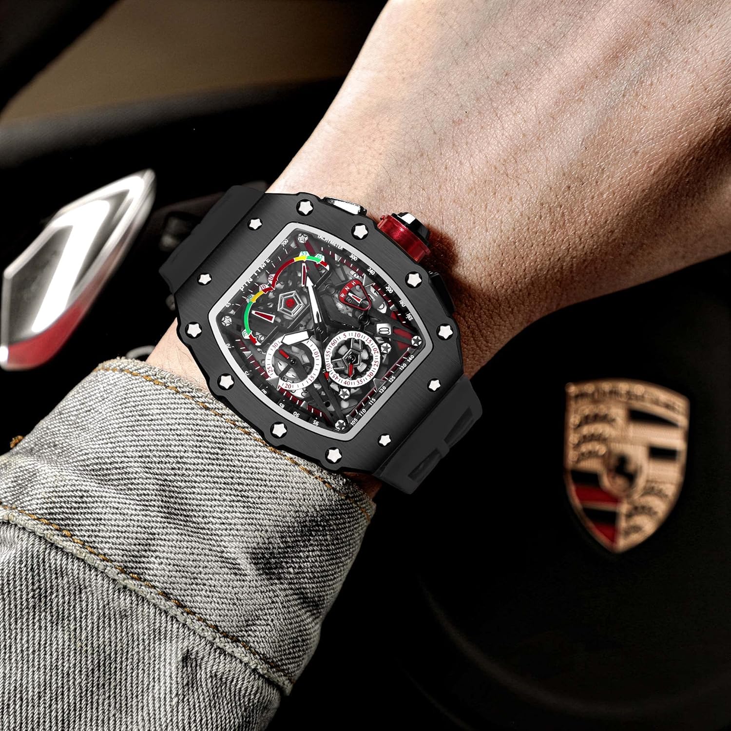 FANMIS Mens Luxury Tonneau Square Watches Analog Punk Chronograph Unique Sports Wrist Watch Japanese Movement Luminous Design with Rubber Band
