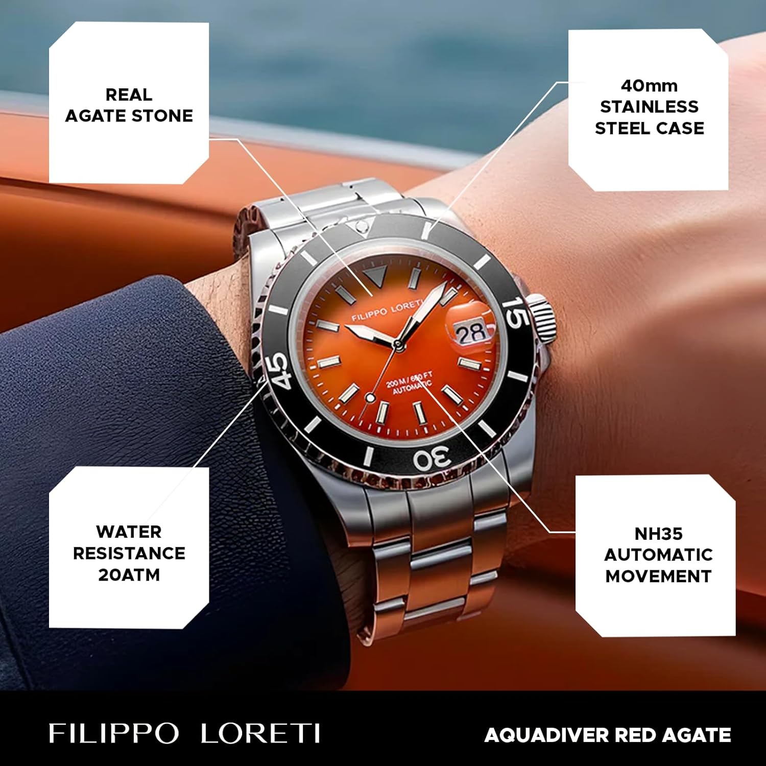 The FILIPPO LORETI Aquadiver is a men’s dive watch that fuses rugged capability with bold design. Built for those who value both performance and presence, it’s engineered to handle the demands of underwater exploration while making a striking impression above the surface. At its heart lies a self-winding automatic movement that powers itself through the natural motion of your wrist, eliminating the need for batteries and delivering dependable timekeeping. With a 200-meter water resistance rating, this watch meets the requirements for recreational scuba diving, snorkeling, and everyday water exposure. The standout feature? A genuine red agate stone dial that gives each watch a one-of-a-kind appearance—its volcanic orange tones shift subtly in different lighting, ensuring no two timepieces are exactly alike.