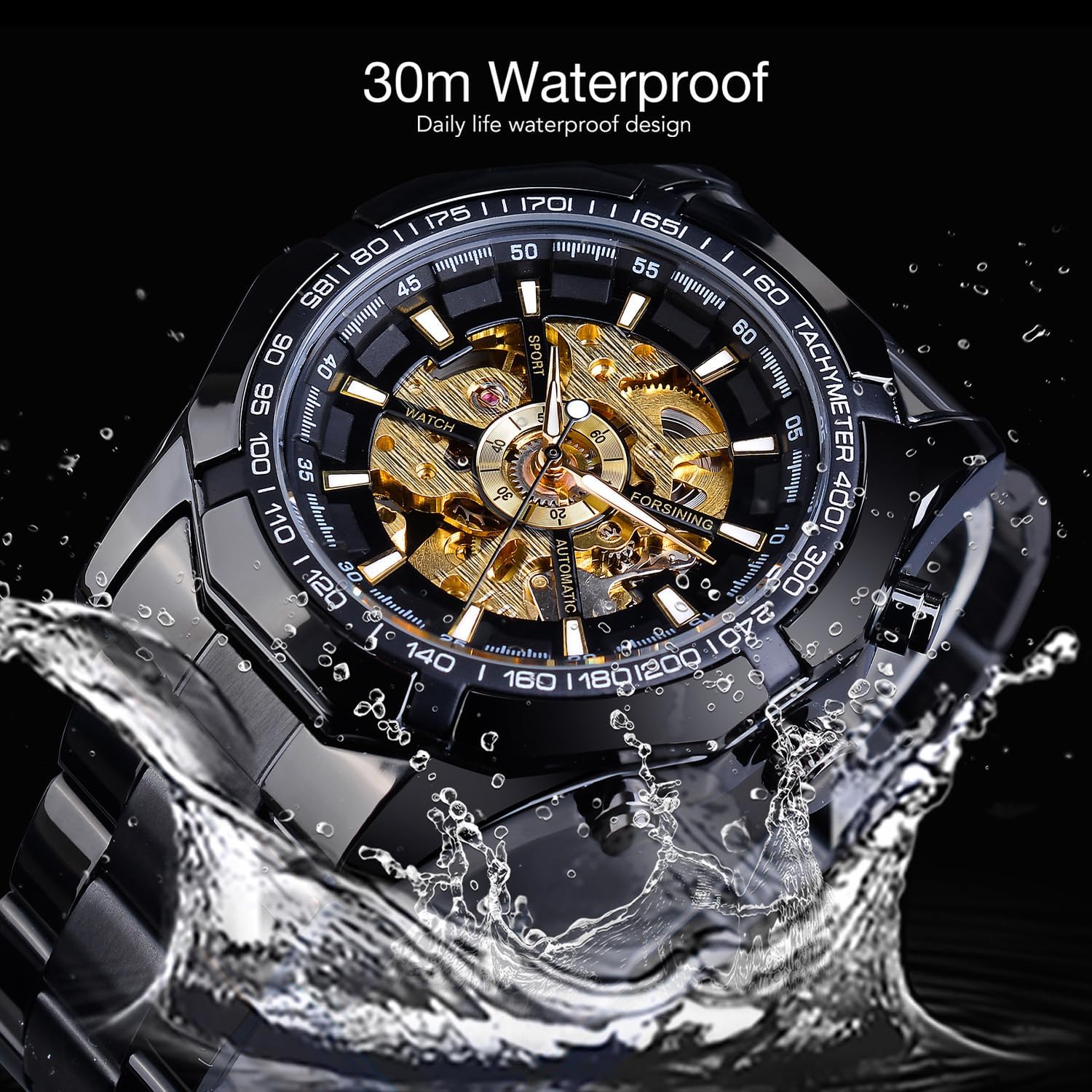 The FORSINING Men’s Watch is a bold mechanical automatic timepiece that blends precision engineering with striking visual design. At its core lies a self-winding movement that powers the watch through the natural motion of your wrist—no batteries required. The standout feature is the skeleton hollow-out dial, which offers an unobstructed view into the intricate mechanics beneath the surface. As the gears and rotor move in rhythm with your movements, the watch becomes more than a timekeeper—it becomes a conversation piece. Crafted for men who appreciate both form and function, this watch features a blue and black stainless steel band that resists corrosion while delivering a sleek, contemporary look. Whether you’re heading to the office, meeting friends for dinner, or attending a formal event, this timepiece adapts effortlessly to your style. With luminous hands and markers for low-light visibility and a 30m water-resistant build, it’s built to handle the demands of everyday life without compromising on elegance.
