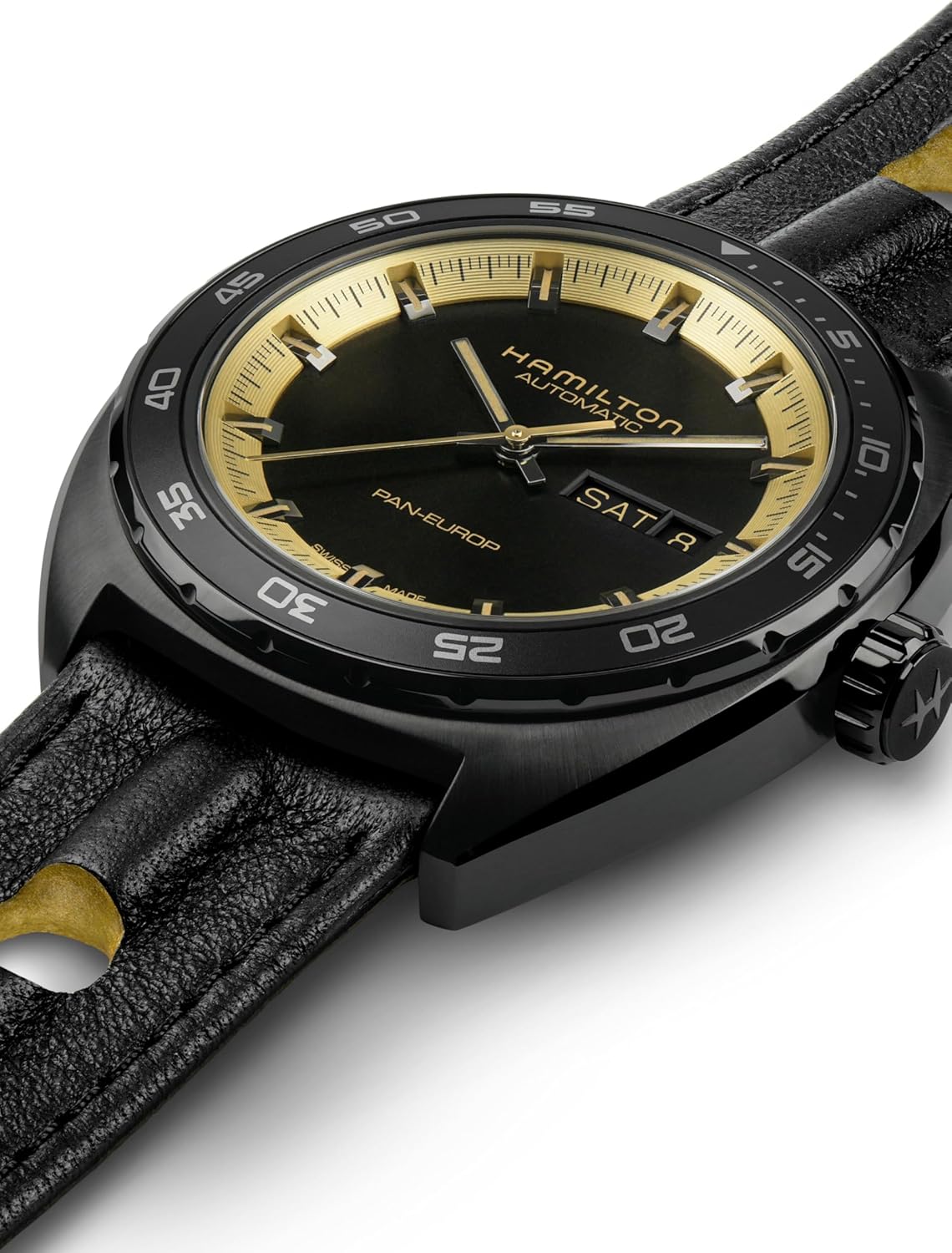 The Hamilton American Classic Pan Europ Day Date Automatic Watch captures the spirit of 1960s European motorsport with a design rooted in vintage racing heritage. This 42mm Swiss-made timepiece features a cushion-shaped stainless steel case and a bold black dial, paying homage to classic Pan-European rally watches while incorporating modern engineering for reliable performance. At its heart lies the H-30 automatic movement, an in-house caliber developed by Hamilton that delivers precision and durability. With an 80-hour power reserve, the watch can run for three full days without being worn or rewound—making it ideal for those who don’t wear their watch every day. The inclusion of day and date functions adds everyday practicality, while the unidirectional rotating bezel enhances both the sporty aesthetic and functional appeal. Protected by scratch-resistant sapphire crystal and paired with a genuine black cow leather strap, this watch balances retro charm with contemporary reliability. Whether you’re drawn to its historical inspiration or its dependable mechanics, the Pan Europ Automatic is built for those who appreciate thoughtful design and Swiss craftsmanship.