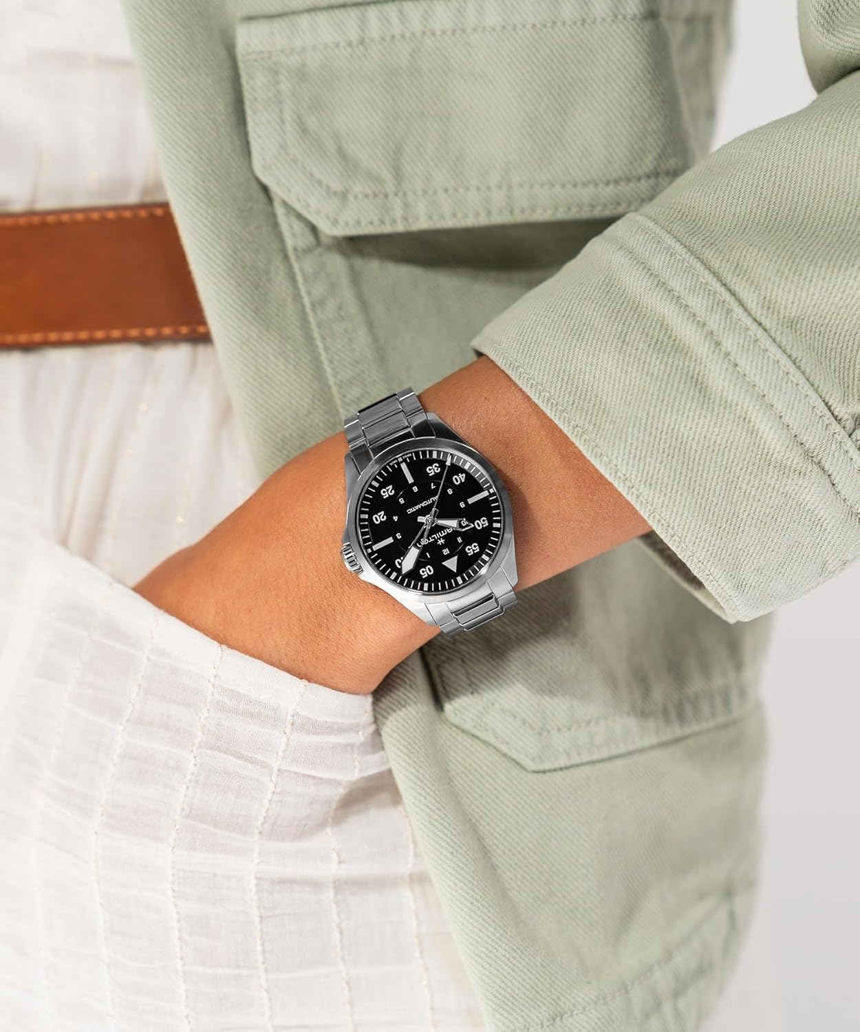 Crafted for true aviation lovers, the Hamilton Khaki Aviation Pilot Automatic Men’s Watch embodies the spirit of exploration and adventure that defines both the Khaki collection and the legacy of flight. With its Swiss-made precision and pilot-inspired design rooted in aviation heritage, this timepiece is built for those who value functionality, reliability, and timeless style. The 39mm stainless steel case houses the reliable H-10 automatic movement with an impressive 80-hour power reserve and features a Nivachron balance spring to resist magnetic interference—ideal for consistent performance without daily winding. Its all-black dial and brushed-polished bracelet create a bold, understated look perfect for pilots, aviators, or anyone who appreciates classic aviation aesthetics. Whether worn during a flight simulation session, a business meeting, or casual weekend outings, this watch delivers trusted performance with enduring appeal.