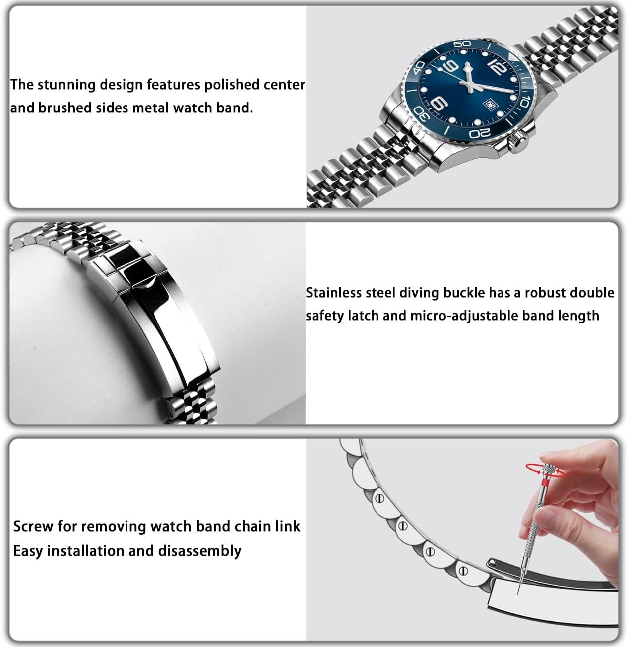 This watch band is ideal for individuals seeking a reliable, stylish replacement for their original bracelet. Its stainless steel build makes it perfect for daily wear, offering resistance to sweat, moisture, and environmental exposure. The adjustable length and large wrist compatibility cater to a broader audience, especially those with bigger wrists who often face limited options. Whether used for professional settings, outdoor activities, or casual outings, the Juntan bracelet enhances the look and functionality of your timepiece. It’s also a practical choice for watch collectors and enthusiasts looking to customize their watches with a high-quality Jubilee-style band.