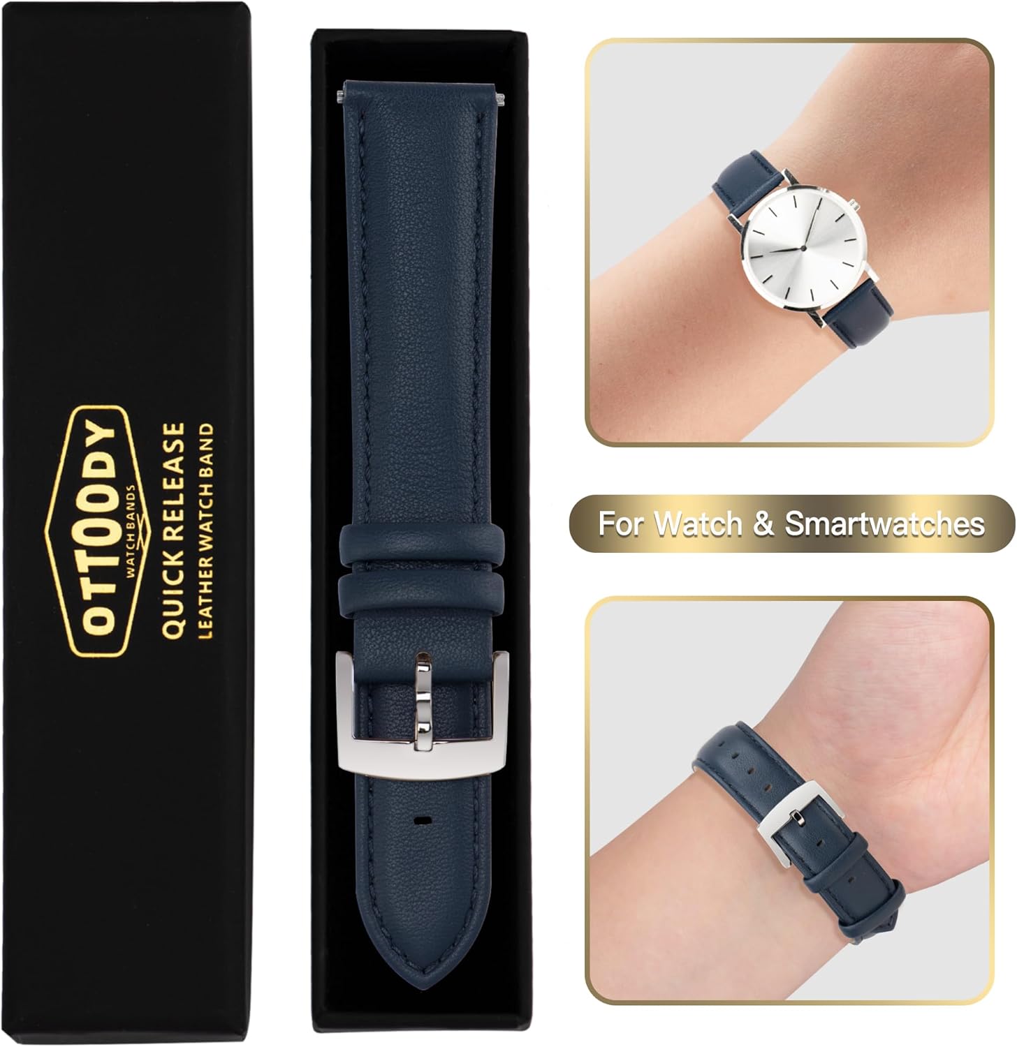 A high-quality watchband requires not only luxury leather but also great quality hardware. We use the quality 316L stainless steel to make buckles, spring bars, and pins, which work fine, are reliable durable. Besides, the designed OTTOODY’s buckle is appropriately curved to be a perfect fit for the wrist and straps. Overall, the quality materials and humanized design come up with a fine detail and craftsmanship leather watch strap.