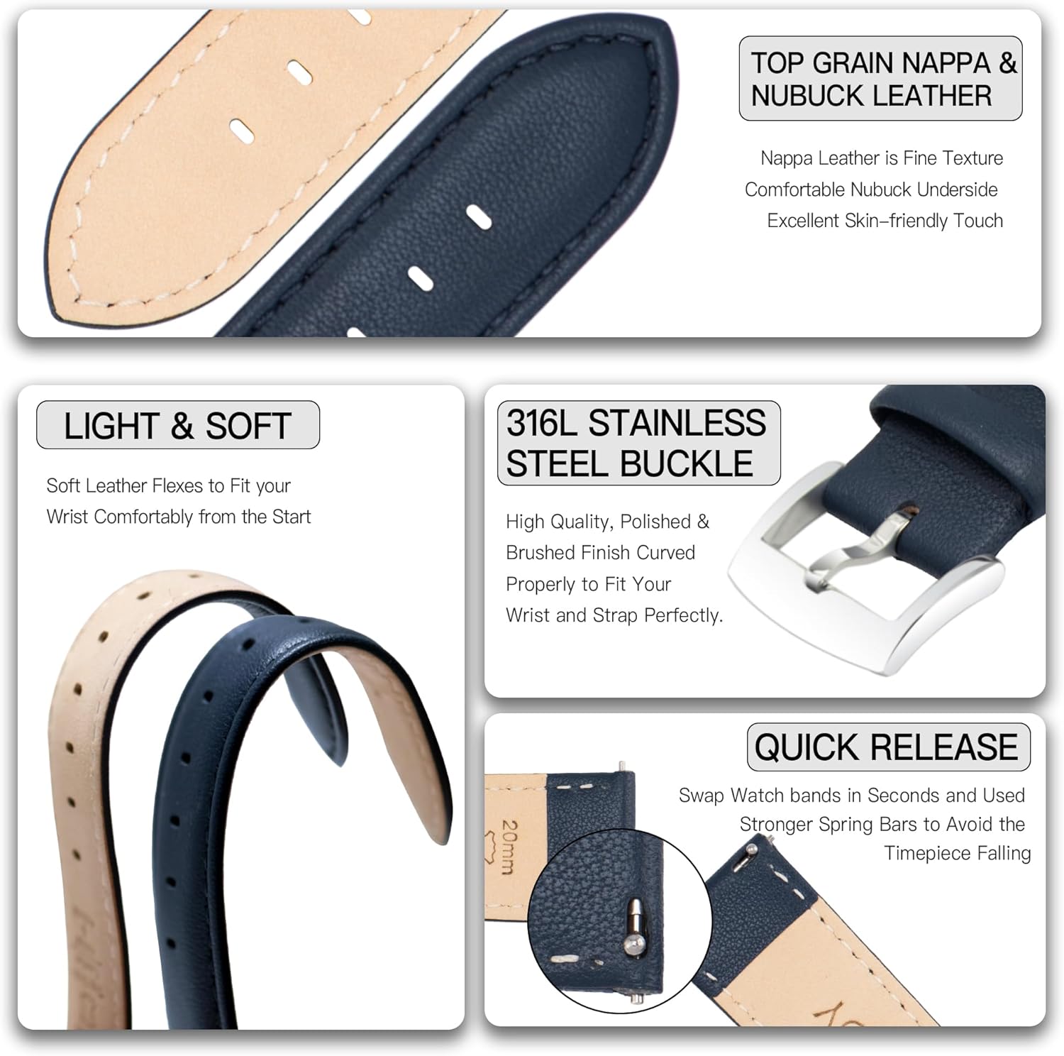 Hand-selected top-grain nappa leather is used for the top layer of the leather watch band, presenting a luxury look with soft and smooth leather. The underside is comfort beige nubuck leather, which is the ideal lining of watch strap that against the skin and minimizes slipping while providing ideal comfort, also anti-bad smell from sweat.