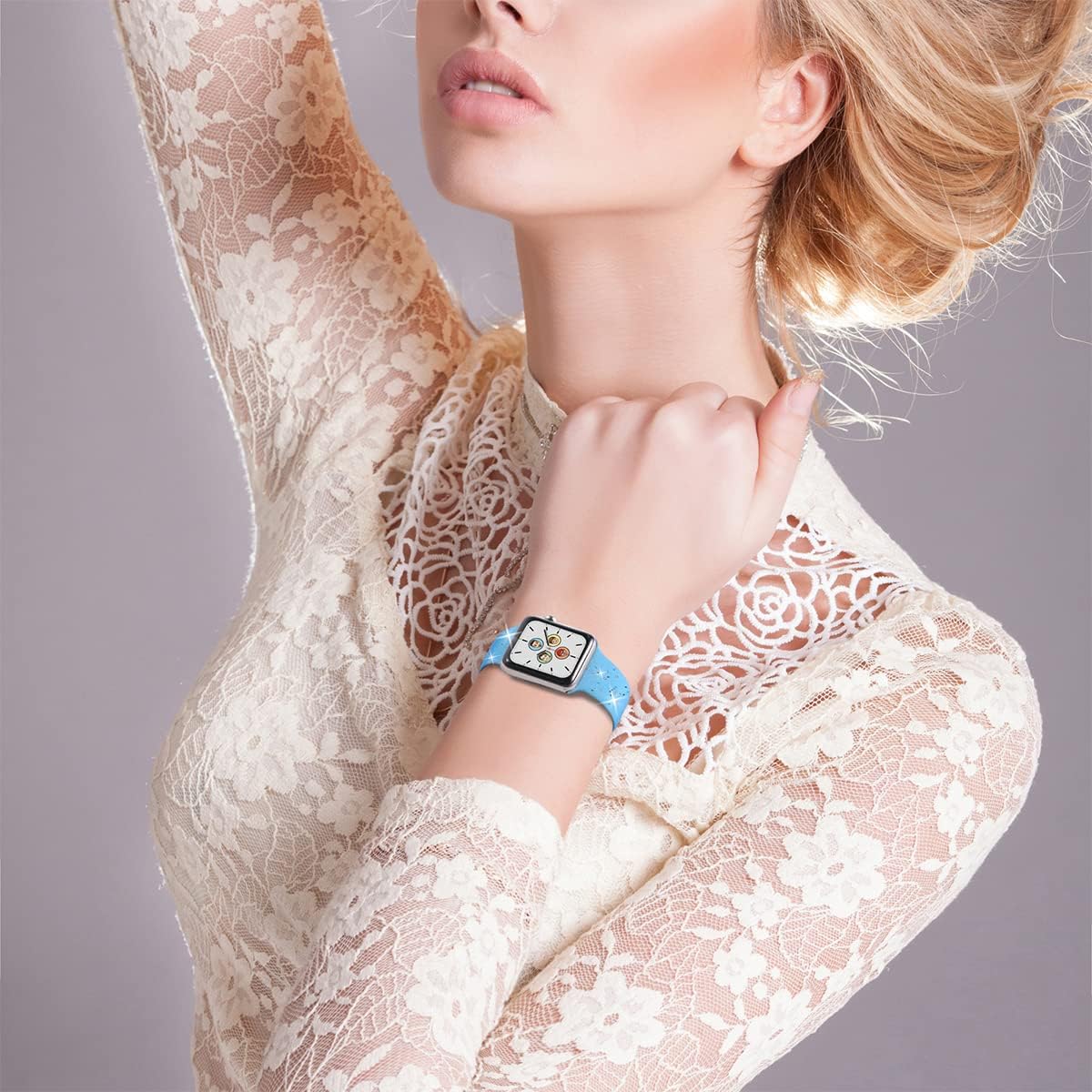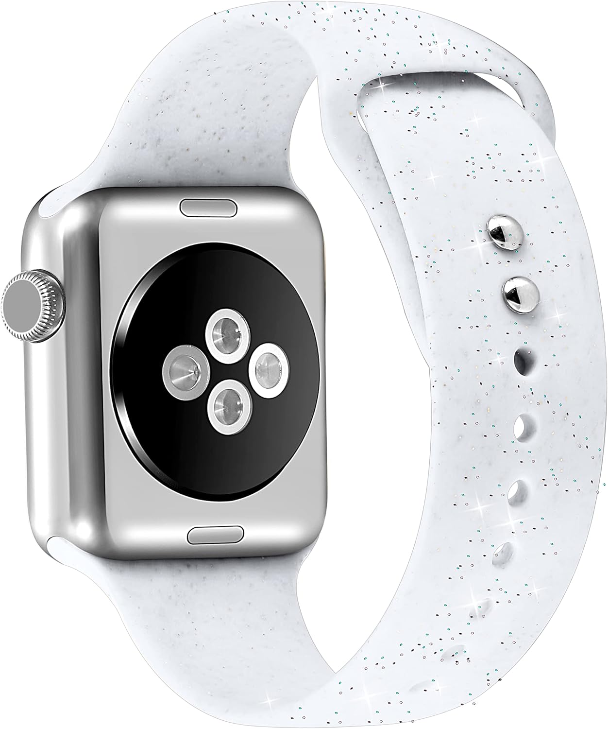 Glad I decided to try this out. The sparkles are both gold and silver, which I like because it will go with any jewelry. Smoother than most silicone bands (though not quite as nice as the Apple bands). Would be nice if they made two sizes as thereâs a lot of length I donât use (and my wrist is probably a medium size (6â). It is harder to get this on as the holes have to stretch for the pegs, but I do like that itâs so secure and they do fit in.