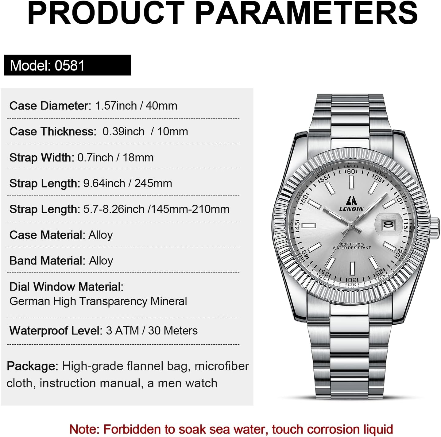 • Premium Stainless Steel Construction – Both the case and bracelet are made from high-quality stainless steel, providing excellent resistance to rust, corrosion, and everyday wear. The material maintains its shine over time and resists scratches, ensuring the watch looks sharp through daily use.