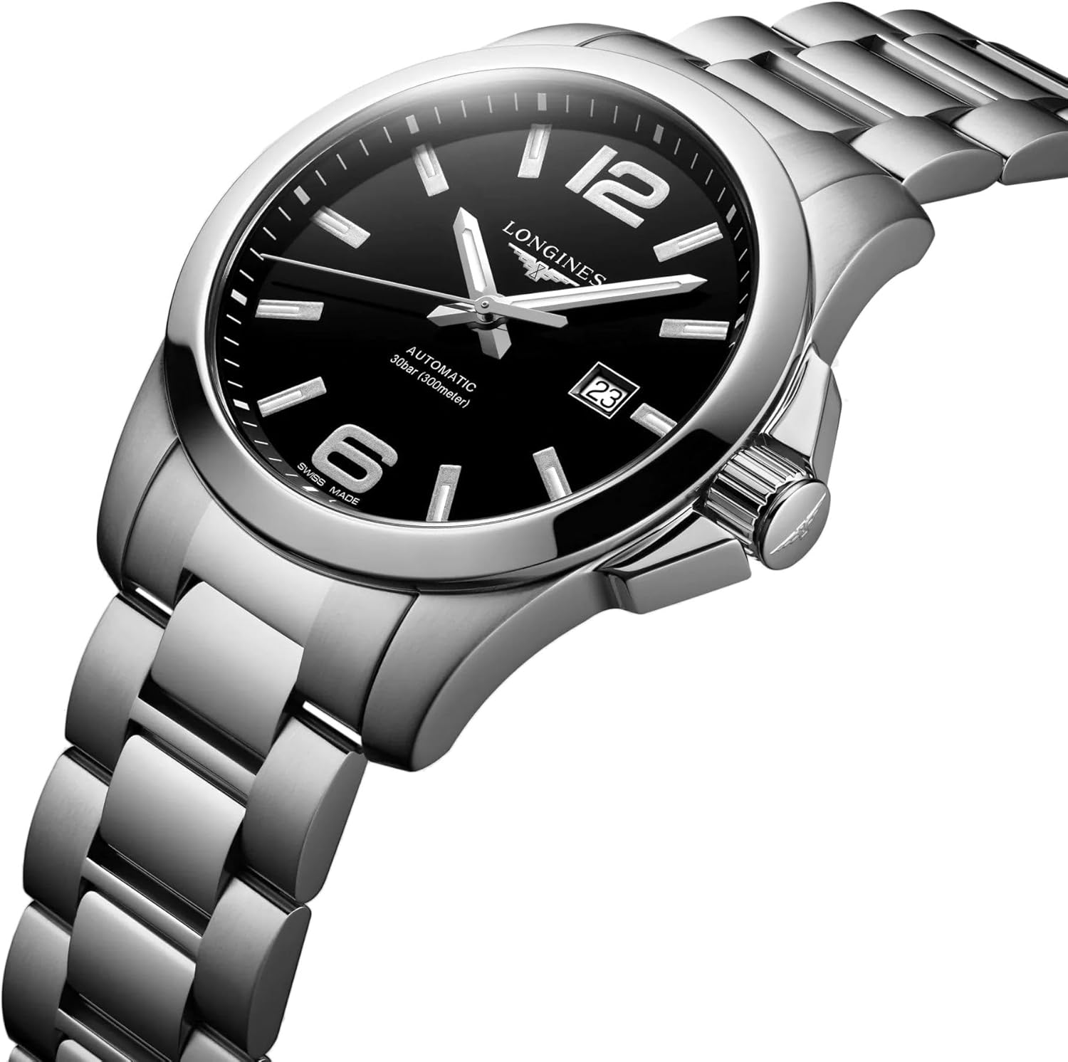 Black dial. Silver-tone stainless steel case with a silver-tone stainless steel band. Automatic movement. 300 meters / 1000 feet water resistance. Fixed bezel. Fold Over with Push Button Release clasp. Case size 43 mm x 12 mm. Longines L3.778.4.58.6 Conquest Watch.