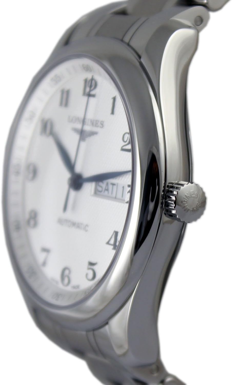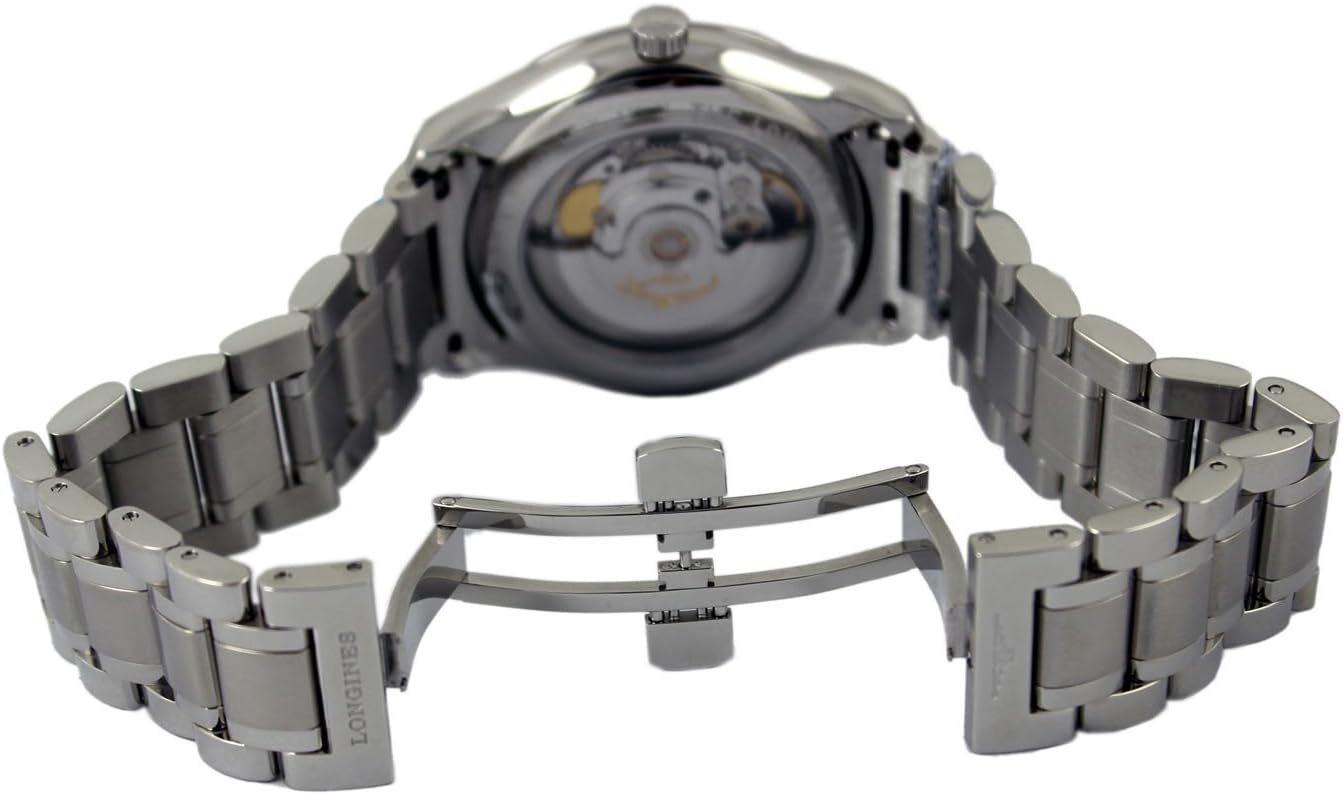 Silver dial enhanced by blue hands. Silver-tone stainless steel case with a silver-tone stainless steel band. Automatic movement. 30 meters / 100 feet water resistance. Fixed bezel. Scratch Resistant Sapphire crystal. Transparent caseback. Fold Over with Push Buitton Release clasp. Screw Down crown. Case size 38.5 mm x 9.5 mm. Band 20 mm x long. Longines L2.755.4.78.6 Master Collection Watch.