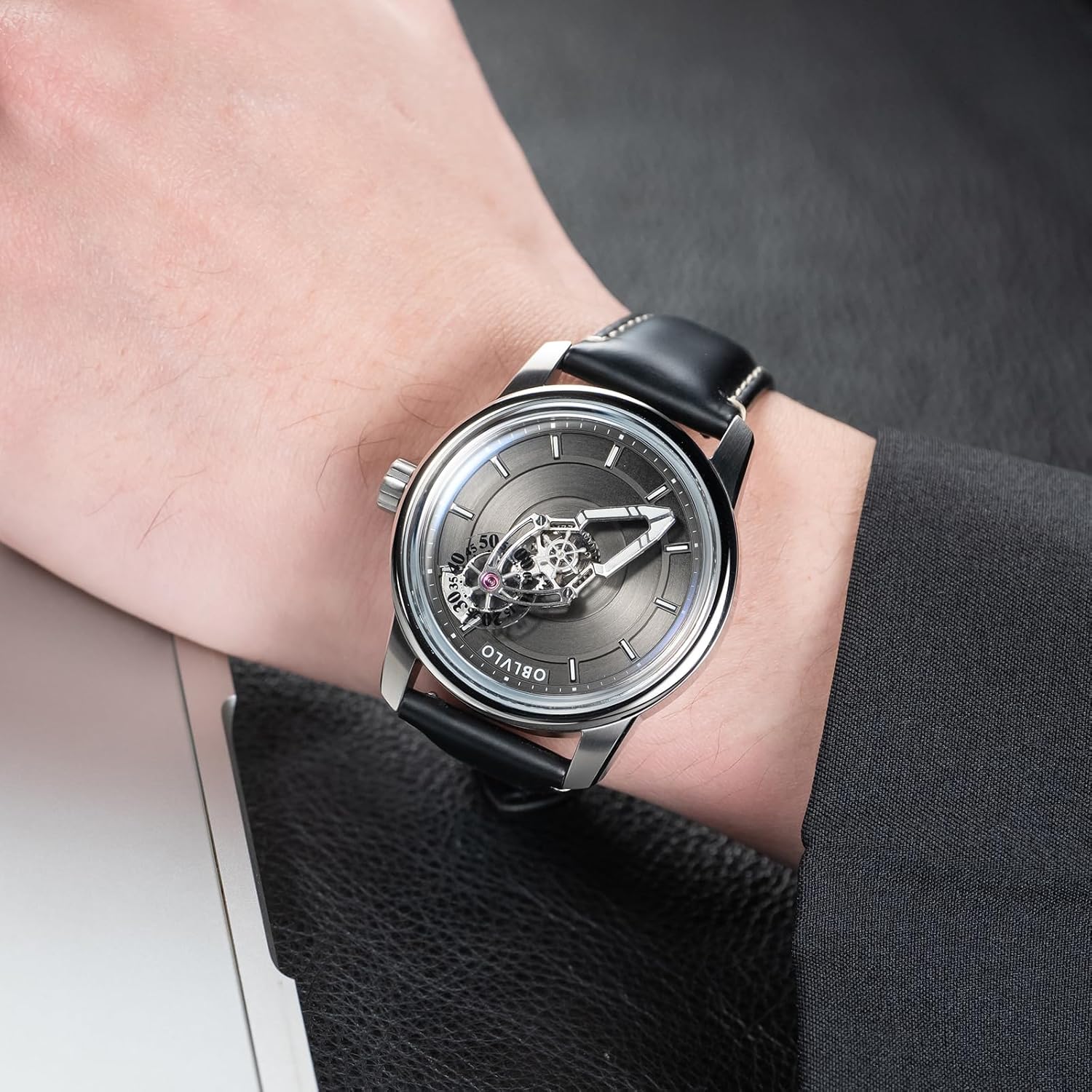 Introducing an exquisite timepiece that seamlessly blends sophistication with innovative design. This OBLVLO watch features a stunning rose gold-tone case complemented by a premium black leather strap with contrasting white stitching. The unique skeleton dial showcases intricate mechanical details through a minimalist silver face, creating a mesmerizing visual display. The distinctive single-hand design offers an unconventional way to tell time, making it both a functional timepiece and a conversation starter. The watch’s elegant construction includes precise markings along the dial’s edge, while the durable crystal face protects the intricate movement beneath. Perfect for those who appreciate haute horlogerie and seek to make a refined statement, this watch combines classical watchmaking traditions with contemporary aesthetics. The comfortable leather band ensures a secure fit for daily wear, while the rose gold accents add a touch of luxury to any ensemble.