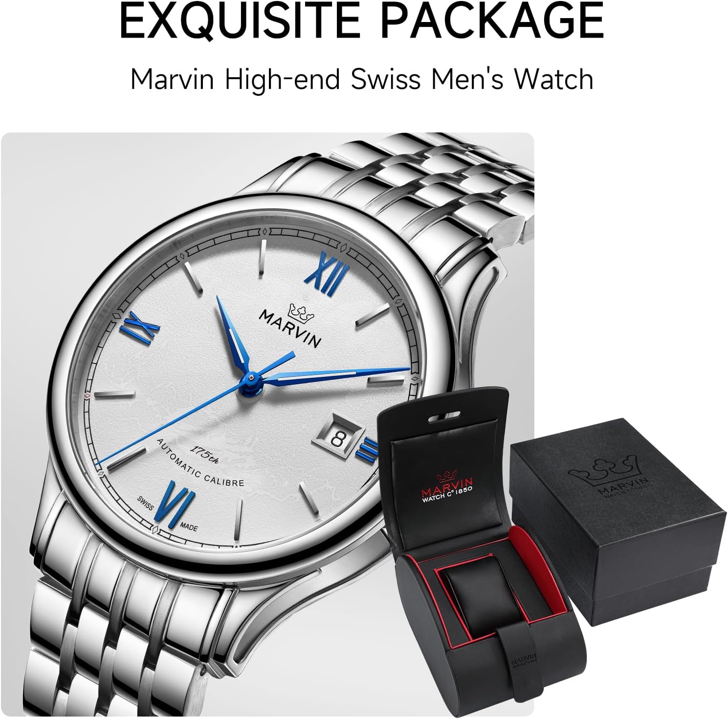 While this watch is water-resistant to 50 meters, it is not suitable for swimming, snorkeling, or diving. Prolonged exposure to water, especially in chlorinated or saltwater environments, should be avoided to maintain integrity. Regular maintenance is recommended to preserve the mechanical movement and overall performance. The product comes with a manufacturer’s warranty; for specific warranty details, please refer to the official Marvin support page. Packaged securely in a premium box, it includes all necessary documentation and is ready for gifting or personal use. Due to its Swiss origin and handcrafted elements, slight variations in finish may occur, adding to the uniqueness of each timepiece.