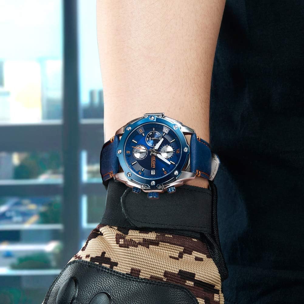 The MEGIR Men’s Business Analogue Quartz Watch combines professional elegance with everyday practicality, making it a smart choice for men who want one watch that fits multiple parts of their life. With its rich blue leather strap and refined chronograph face, this timepiece transitions smoothly from the office to outdoor adventures. Powered by reliable quartz movement, it delivers accurate timekeeping and includes essential features like a luminous display and automatic calendar. Whether you’re in a boardroom, on a hiking trail, or meeting friends for dinner, this watch offers consistent performance and a polished look that complements any occasion.