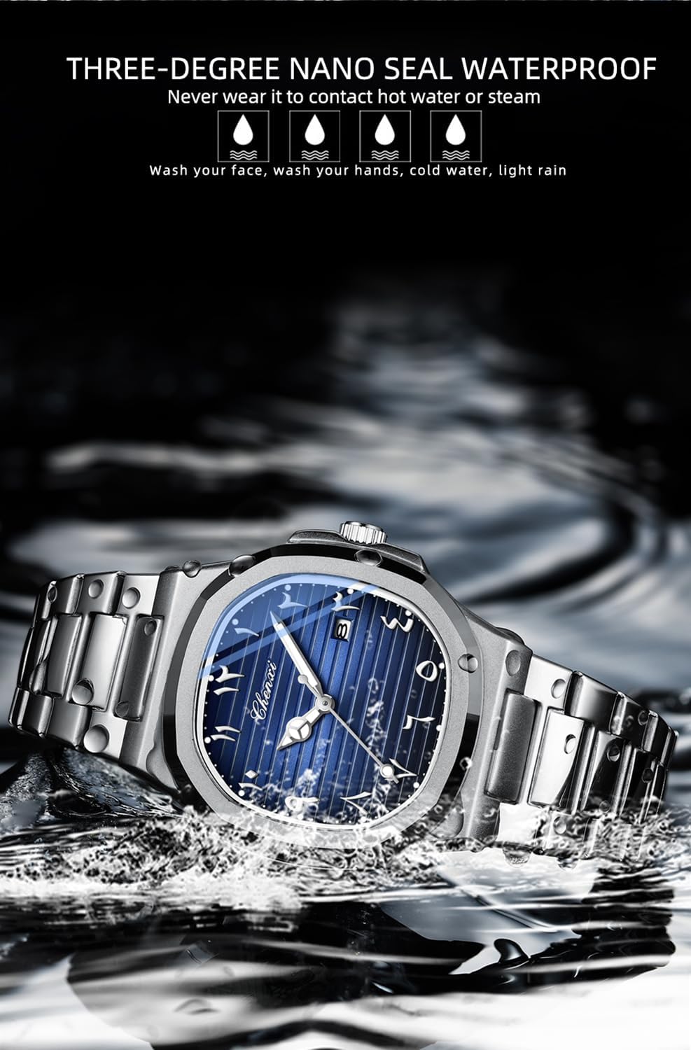 - 30M Life Waterproof Design – Constructed with a sealed waterproof ring, this watch effectively resists splashes from handwashing, rain, and brief contact with water. It is suitable for everyday moisture exposure but should not be worn while swimming, showering, or exposed to warm or hot water, as heat can compromise the internal seals and reduce water resistance.
