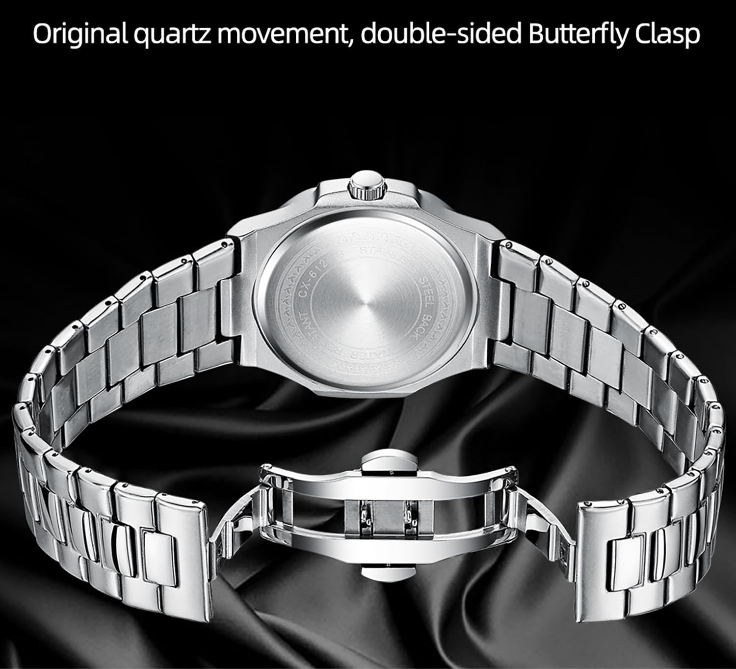 - Stainless Steel Strap – The band is made from durable stainless steel, offering a secure and adjustable fit for most wrist sizes. Resistant to corrosion and fading, it maintains its finish through daily wear and pairs well with formal, business, or casual attire.