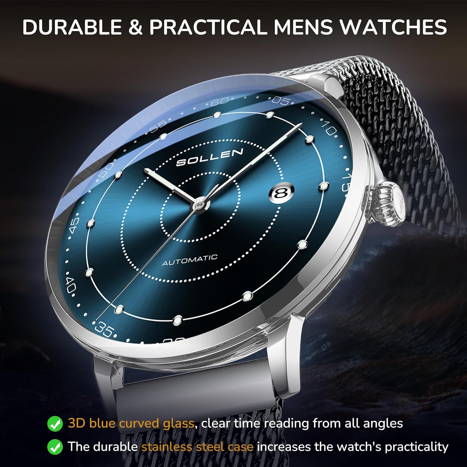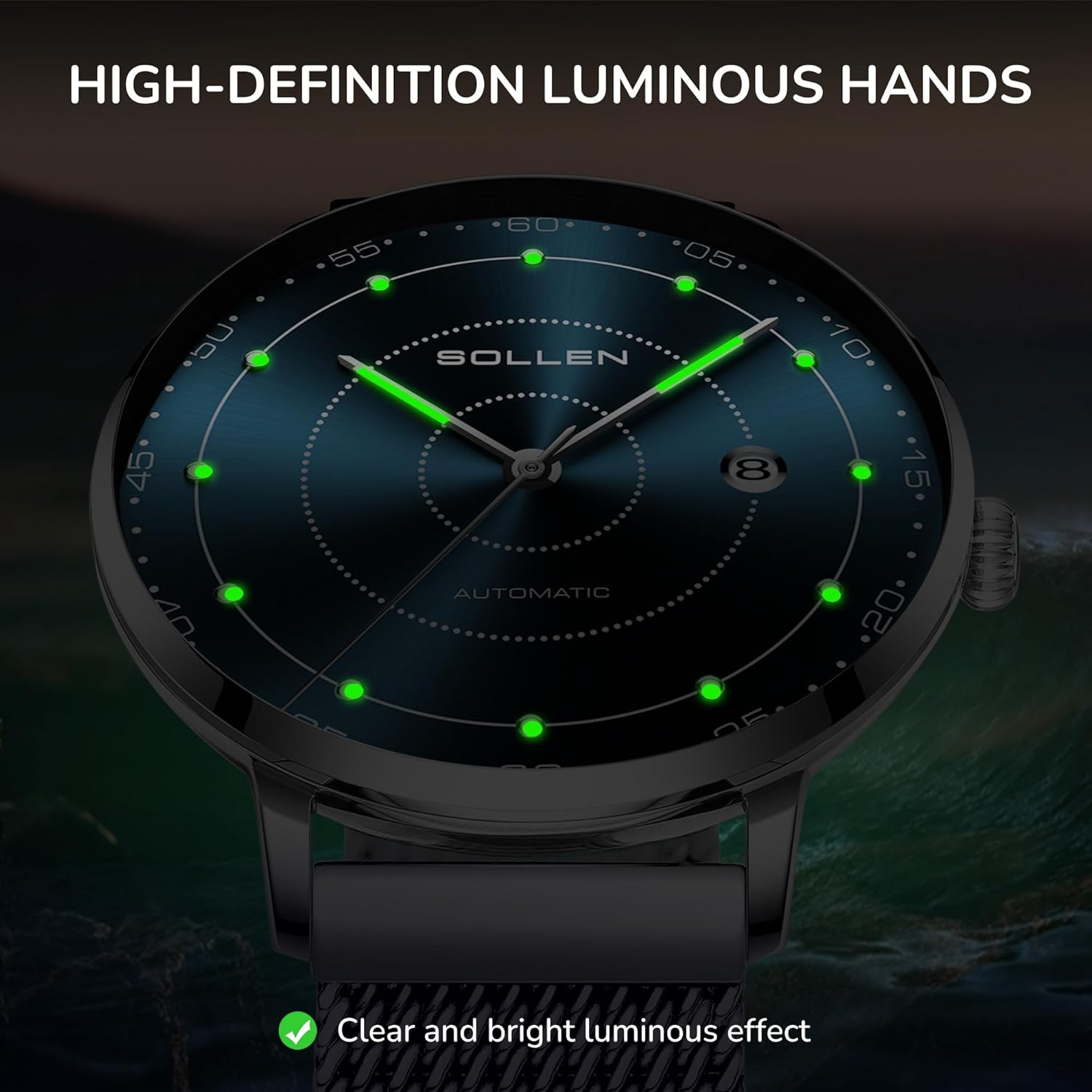 The SOLLEN Minimalist Men’s Automatic Watch combines timeless design with reliable mechanical functionality, making it a refined choice for the modern man. This self-winding watch operates without a battery, harnessing motion from daily wear to keep accurate time. Crafted for those who appreciate understated elegance, it suits both professional settings and formal occasions. With its sleek stainless steel build and luminous display, it delivers practicality and style in one sophisticated package. Whether worn daily or reserved for special events, this watch stands as a lasting statement of taste and precision.