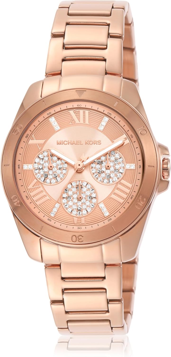 This Michael Kors Women’s Bradshaw watch is a chic and feminine way to be on-trend this season. This watch features a stainless steel bracelet strap and a round rose stainless steel face with classic roman numeral indexes.