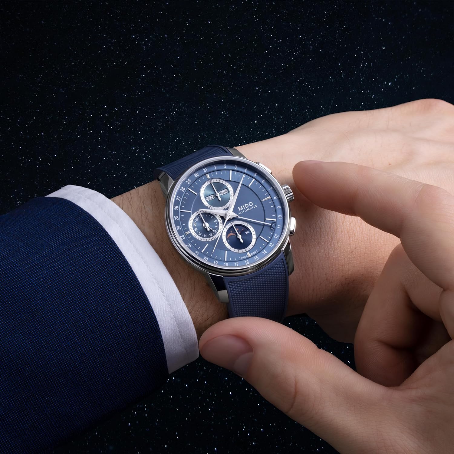 The MIDO Baroncelli Chronograph Moonphase is a Swiss automatic watch crafted for men who value precision engineering, timeless design, and the artistry of mechanical timekeeping. With a 42mm stainless steel case, this timepiece strikes a refined balance between presence and wearability, making it a versatile companion for both professional environments and everyday life. Rooted in the legacy of MIDO—founded in 1918 by Georges Schaeren—the Baroncelli collection embodies the brand’s enduring philosophy of measuring time with both accuracy and elegance. The name MIDO itself, drawn from the Spanish phrase “yo mido” meaning “I measure,” reflects a deep-rooted commitment to horological excellence. This particular model merges traditional complications with contemporary functionality, offering a sophisticated statement piece that honors Swiss watchmaking heritage while meeting modern expectations.