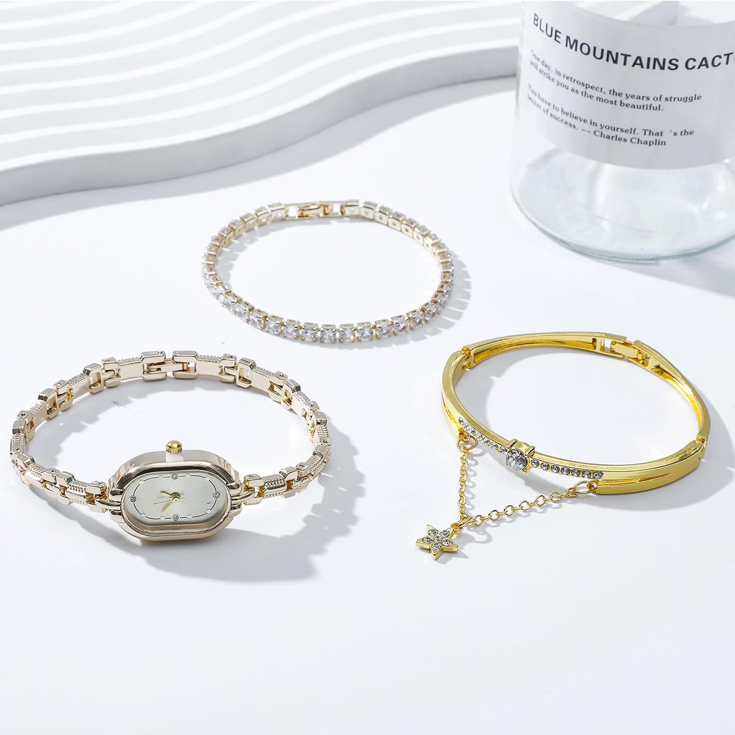 - Complete 3-Piece Coordinated Set: Includes one oval wristwatch and two bangle bracelets, all styled to match for a unified, put-together look. The pieces are designed to be worn together or individually, offering flexibility in styling.