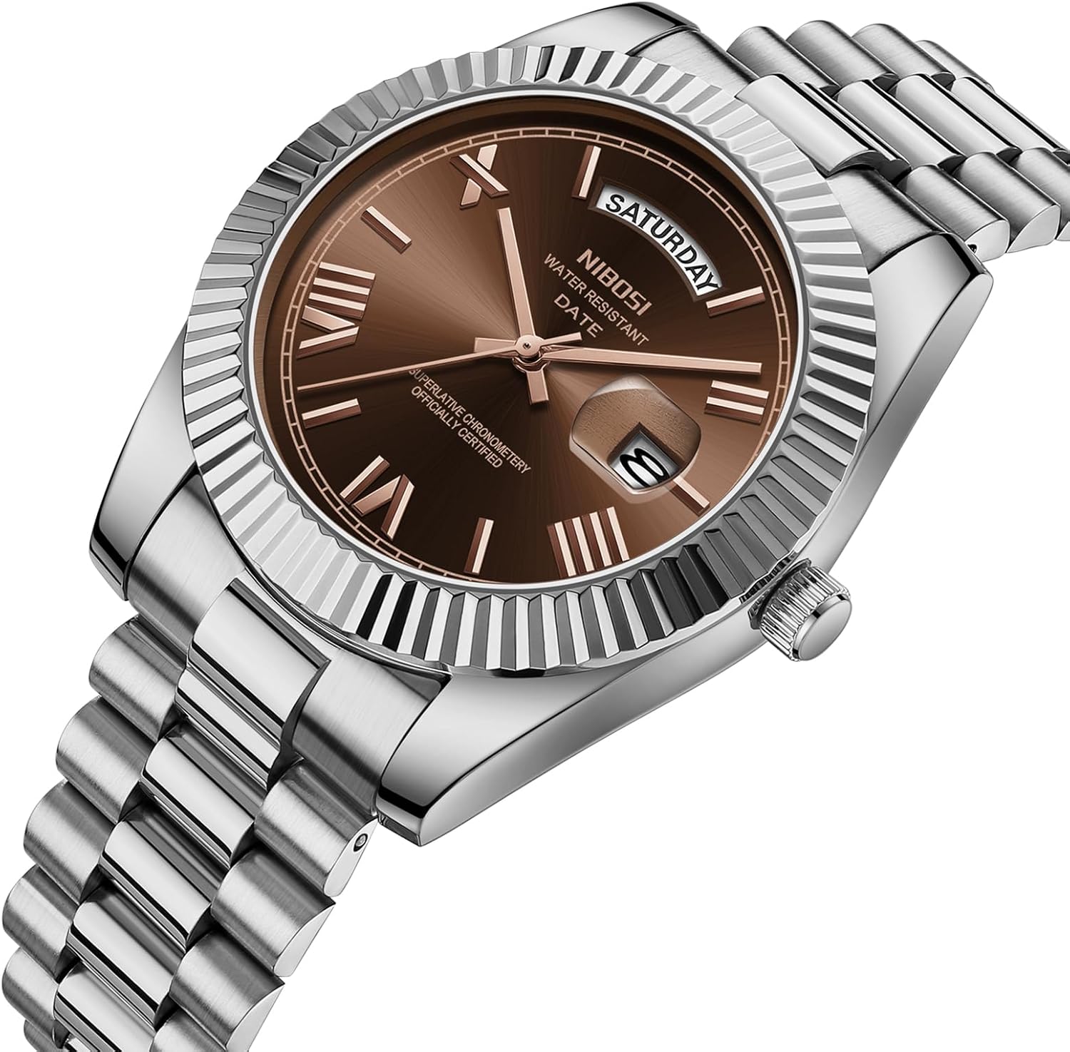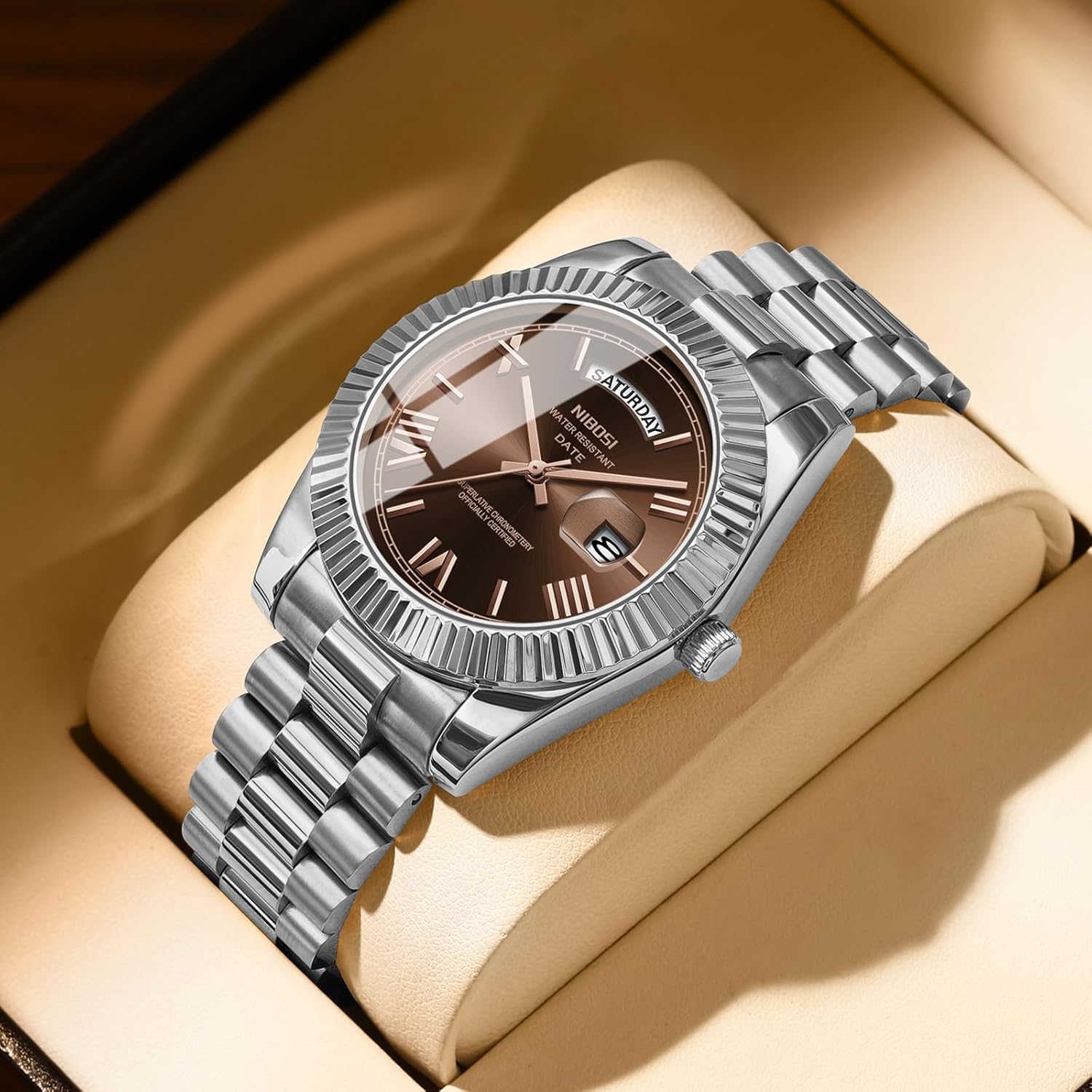 This NIBOSI watch is perfectly suited for professionals who need a stylish yet functional accessory for work environments, client meetings, or formal occasions. Its minimalist analog design and polished stainless steel finish make it a versatile addition to any wardrobe, easily complementing both business attire and relaxed weekend outfits. The day-date display enhances daily usability, allowing wearers to keep track of meetings, deadlines, and personal commitments at a glance. Thanks to its 3ATM water resistance, the watch remains protected during everyday encounters with moisture, such as washing hands, light rain, or accidental spills. The adjustable stainless steel band ensures a snug and comfortable fit for most wrist sizes, while the secure folding clasp with push-button release minimizes the chance of accidental loss. Whether worn as a daily driver or reserved for special events, this watch delivers consistent performance, enduring style, and practical functionality.