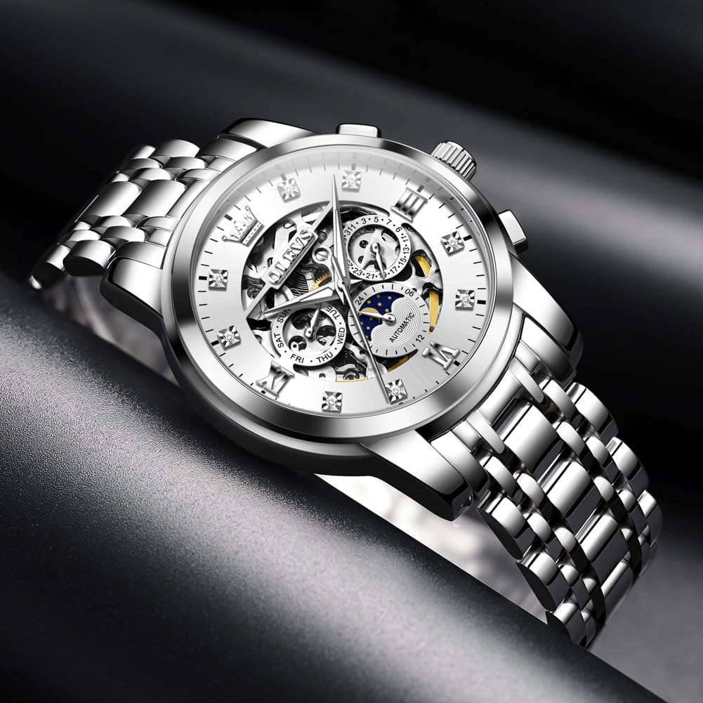 This OLEVS automatic watch is built for men who want a reliable, stylish accessory that transitions seamlessly from office to evening events. The self-winding mechanism means you’ll rarely need maintenance—just wear it regularly to keep it running smoothly. The skeleton dial and moon phase feature make it a conversation starter, perfect for watch enthusiasts or collectors. Its waterproof design ensures it holds up during daily routines, while the adjustable strap guarantees a comfortable fit for most wrist sizes. Whether you’re dressing up for a business meeting or adding flair to casual attire, this watch complements a wide range of styles. It also makes a thoughtful gift for milestones like birthdays, anniversaries, or promotions.