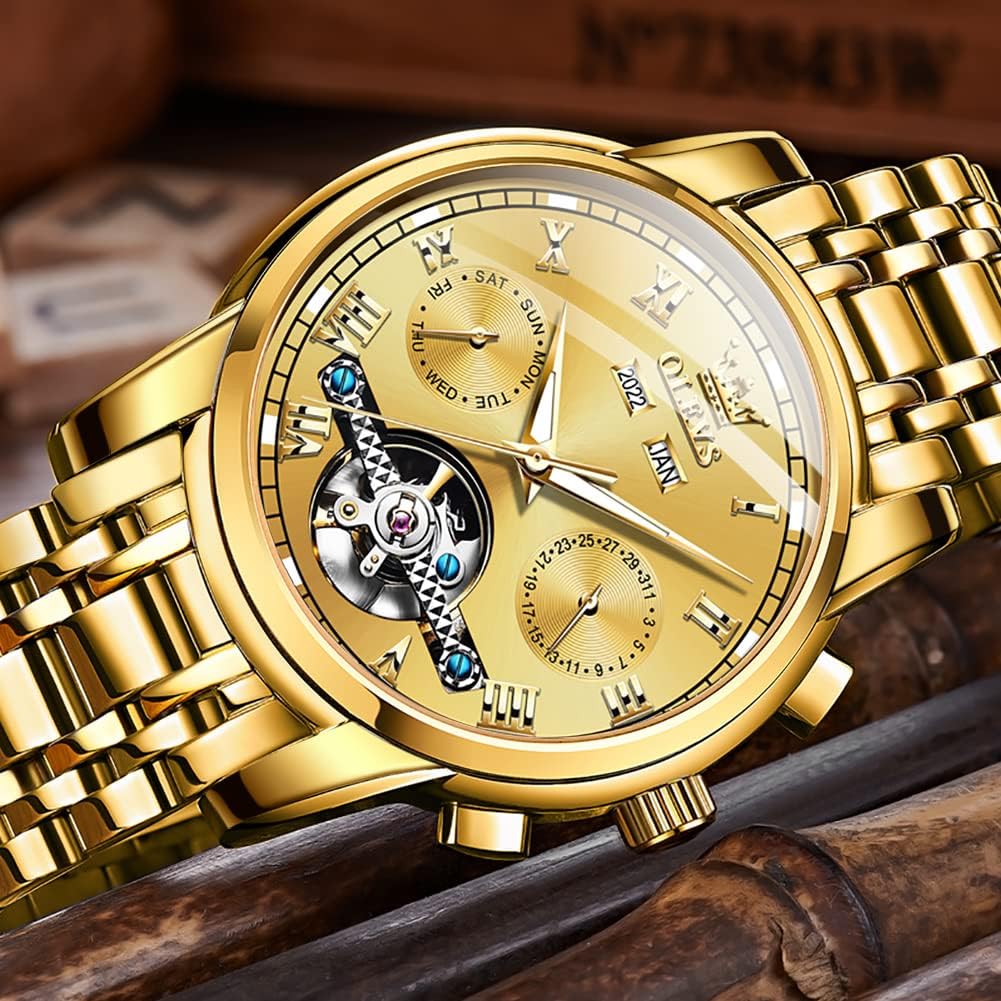 The OLEVS Automatic Watch is a self-winding mechanical timepiece designed for men who appreciate the artistry of traditional watchmaking without the inconvenience of battery replacements. Powered entirely by the natural motion of your wrist, this watch combines timeless craftsmanship with modern design elements, making it a versatile accessory for everyday wear or special occasions. Its skeletonized dial offers a mesmerizing glimpse into the inner workings of the tourbillon mechanism—a hallmark of mechanical precision—where the rotating escapement becomes a dynamic centerpiece. Whether you’re heading to a business meeting, enjoying a casual weekend outing, or attending a formal event, this watch delivers both reliable function and sophisticated style. The package includes an adjustable metal bracelet and a complimentary gift tool, allowing for easy resizing and making it an excellent choice for gifting.