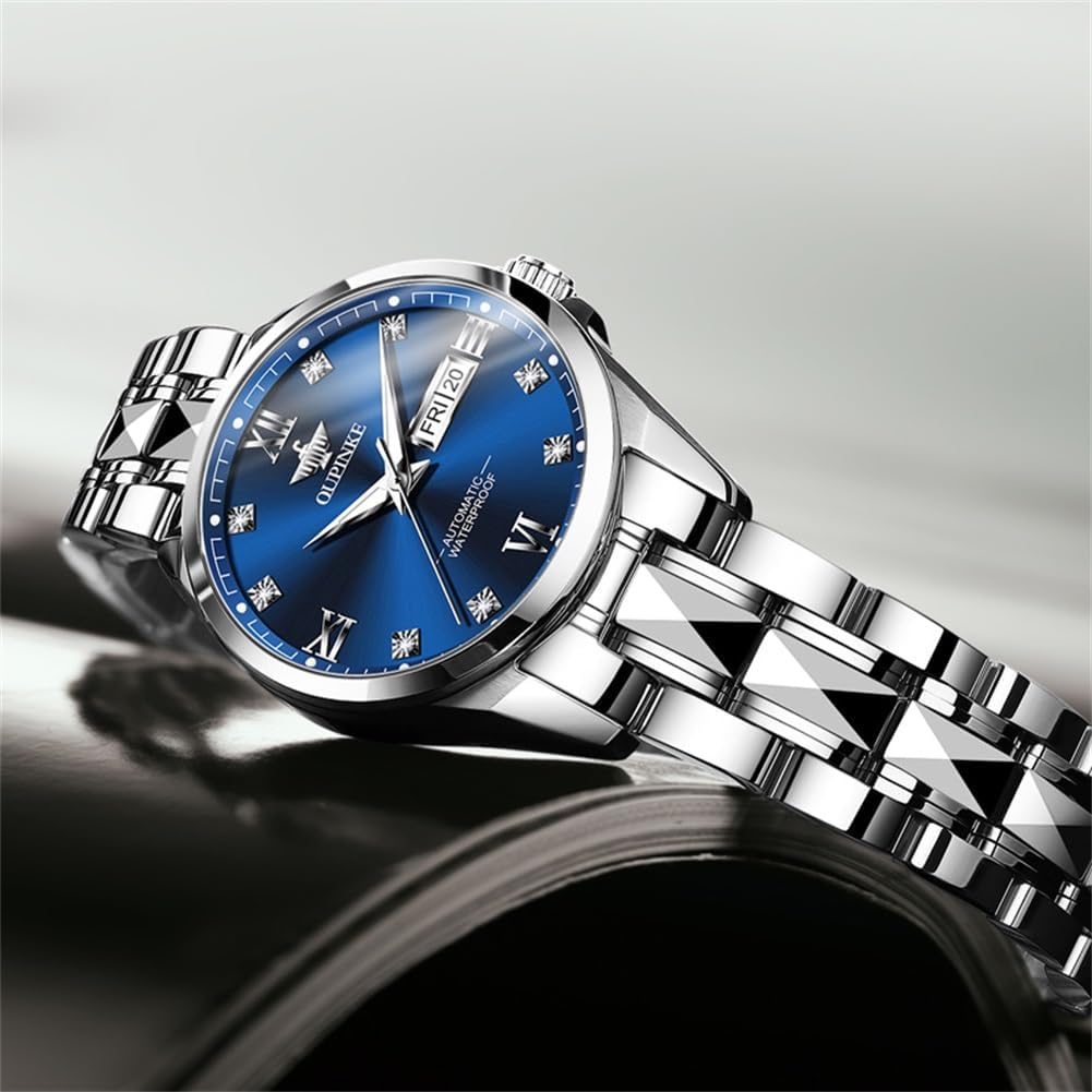 The OLEVS Automatic Women’s Watch is a refined blend of style and functionality, crafted for women who value both aesthetic appeal and mechanical reliability. At the heart of this timepiece is an automatic mechanical movement that harnesses the natural motion of your wrist to keep accurate time—no batteries required. This self-winding mechanism not only reduces maintenance but also offers a traditional watchmaking experience that many appreciate in a modern accessory. The watch features a striking blue dial set within a two-tone stainless steel case and bracelet, creating a balanced contrast between cool tones and metallic highlights. This design makes it easy to pair with a variety of outfits, from business casual to evening wear.