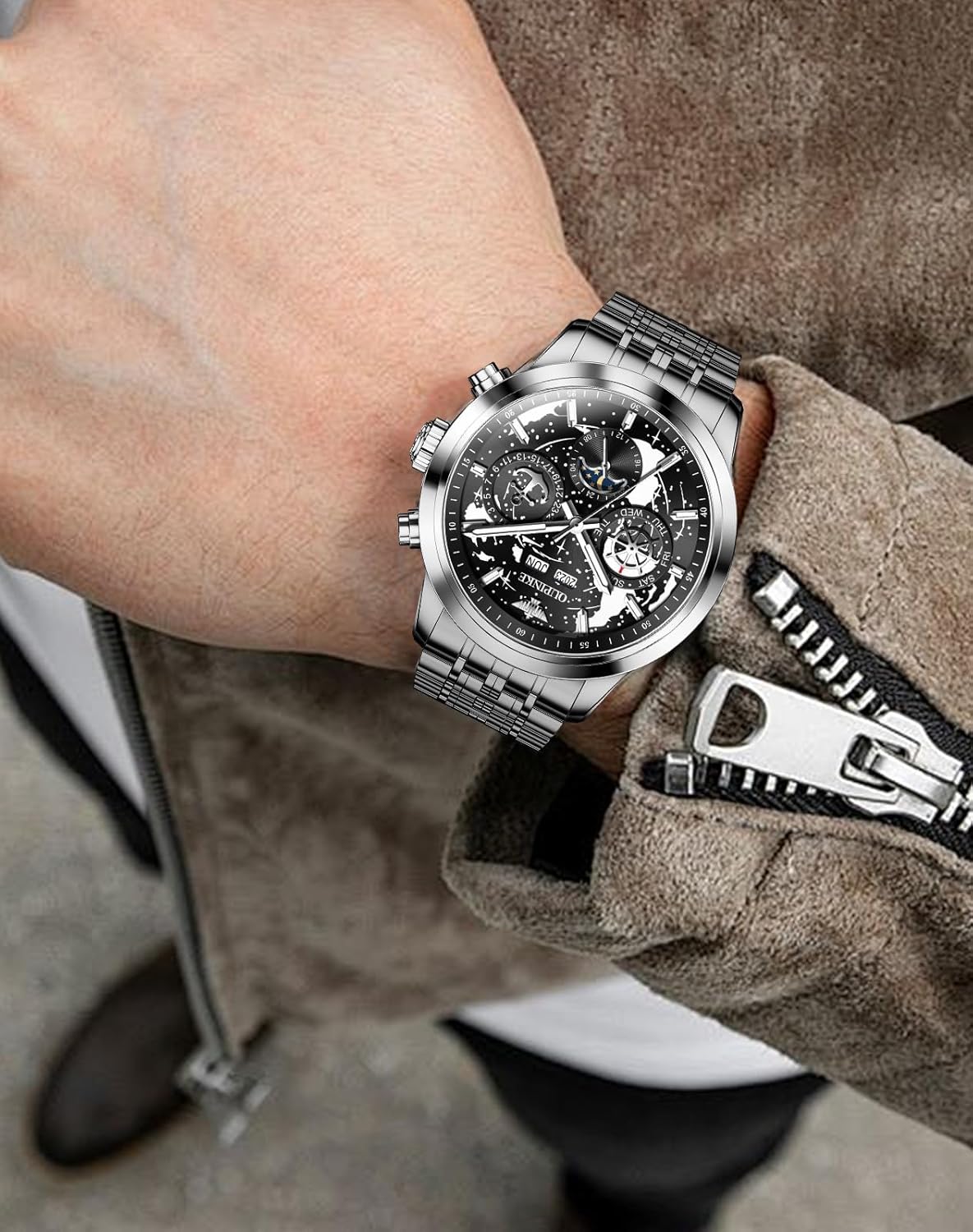 This automatic watch is ideal for men who appreciate mechanical artistry and timeless style. Its self-winding mechanism ensures consistent performance without the need for battery changes, making it a low-maintenance luxury accessory. The moon phase and calendar functions provide practical utility for professionals and enthusiasts alike, while the waterproof design allows for worry-free wear in various environments. Whether worn during business meetings, formal events, or casual outings, this watch enhances any ensemble with its bold skeleton design and diamond detailing. It also makes a distinguished gift for special occasions such as birthdays, anniversaries, or career milestones.