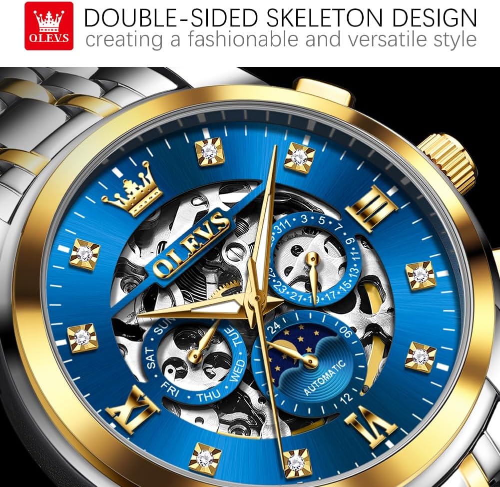The OLEVS Men’s Automatic Watch combines mechanical precision with striking visual design, creating a timepiece that stands out for both its craftsmanship and elegance. At its core is a fully automatic mechanical movement that operates without batteries—powered solely by the natural motion of your wrist. This self-winding mechanism not only ensures reliable timekeeping but also offers a tangible connection to traditional watchmaking artistry. The skeleton dial design reveals the intricate inner workings of the movement, including the balance wheel and gear train, transforming the watch into a dynamic display of mechanical beauty. Ideal for men who value both form and function, this dress watch transitions seamlessly from professional environments to evening events, offering a refined presence on the wrist.