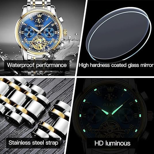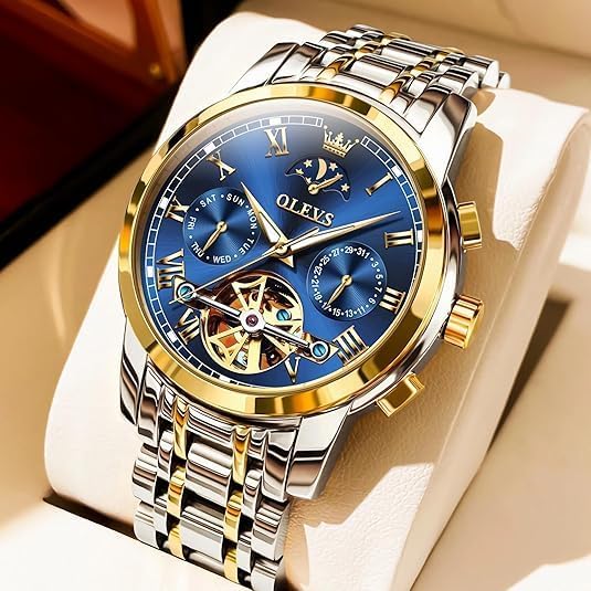 The OLEVS Men’s Automatic Skeleton Tourbillon Watch represents a harmonious fusion of mechanical artistry and functional elegance, designed for the modern gentleman who values both precision and aesthetic sophistication. This luxury dress wristwatch features a fully exposed movement through its transparent caseback, offering an immersive view of the intricate skeletonized components and the mesmerizing dance of the tourbillon mechanism. As a self-winding mechanical timepiece, it harnesses the natural motion of your wrist to maintain consistent power, eliminating the need for daily manual winding. Whether you’re attending a formal event, closing a business deal, or simply appreciating fine craftsmanship in everyday life, this watch delivers refined performance with unmistakable presence.