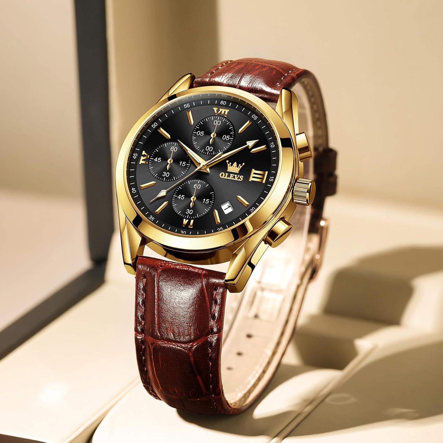 OLEVS Men’s Chronograph Leather Watch, Big Face Easy to Read