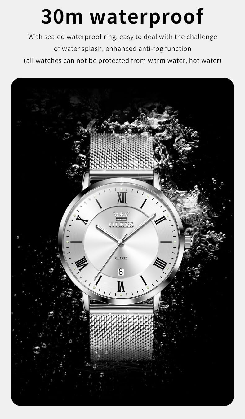 Please consult the manufacturer’s official website for complete warranty details and service options. While the watch is designed to be water-resistant, it is not suitable for swimming, diving, showering, or prolonged exposure to water. To preserve its finish and functionality, avoid contact with perfumes, cleaning agents, saltwater, and abrasive surfaces. Clean the case and bracelet gently with a soft, dry cloth to maintain the gold plating and prevent buildup. If the bracelet feels too loose or tight, it may require adjustment; professional resizing or link removal is recommended for optimal fit. Always ensure the crown is fully pushed in and secured after any handling to maintain the watch’s water-resistant properties. With proper care, this OLEVS watch will continue to deliver reliable performance and elegant style for years to come.