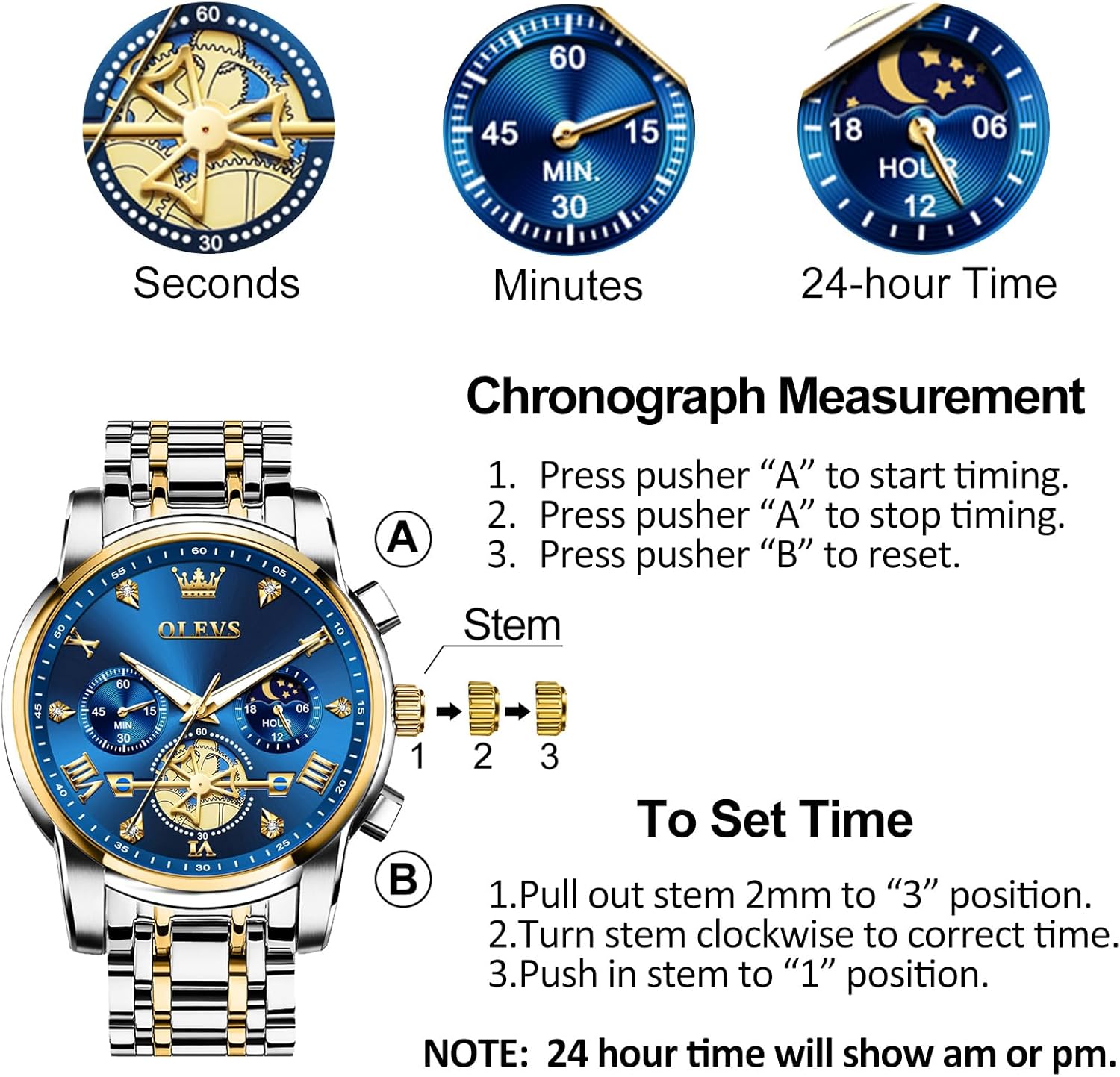 This OLEVS chronograph watch is ideal for men who seek a balance between classic design and functional performance. The large dial with Roman numerals and diamond accents makes it particularly well-suited for individuals who value readability and refined style. Whether worn with a business suit, a smart-casual ensemble, or formal evening attire, the watch complements a wide range of outfits. Its stainless steel build ensures durability for daily wear, while the water-resistant design allows for worry-free use during everyday activities like washing hands or getting caught in the rain. The luminous hands enhance usability in low-light settings, making it practical for evening events or early morning routines. As a quartz-powered timepiece, it offers dependable accuracy with minimal upkeep—perfect for those who want a reliable watch that doesn’t require frequent adjustments.