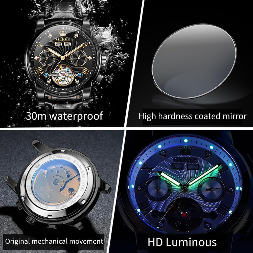 The OLEVS Men’s Watch is a meticulously crafted mechanical timepiece that blends traditional watchmaking artistry with modern functionality. Designed for professionals and watch connoisseurs, this automatic skeleton watch offers an unobstructed view into its complex inner workings, showcasing the rhythmic dance of gears and springs through a transparent dial. At the heart of the design lies a tourbillon mechanism—a rare and prestigious feature in mechanical watches—that not only enhances timekeeping precision by counteracting gravitational distortion but also serves as a captivating visual focal point. Paired with practical complications like a calendar and moon phase display, this watch delivers both elegance and utility. The luminous hands and markers ensure legibility in low-light settings, while the genuine leather strap provides comfort and a refined aesthetic suitable for business meetings, formal events, or everyday sophistication. With its waterproof build, it’s built to handle the demands of daily life, making it a reliable companion for the modern man who values both form and function.