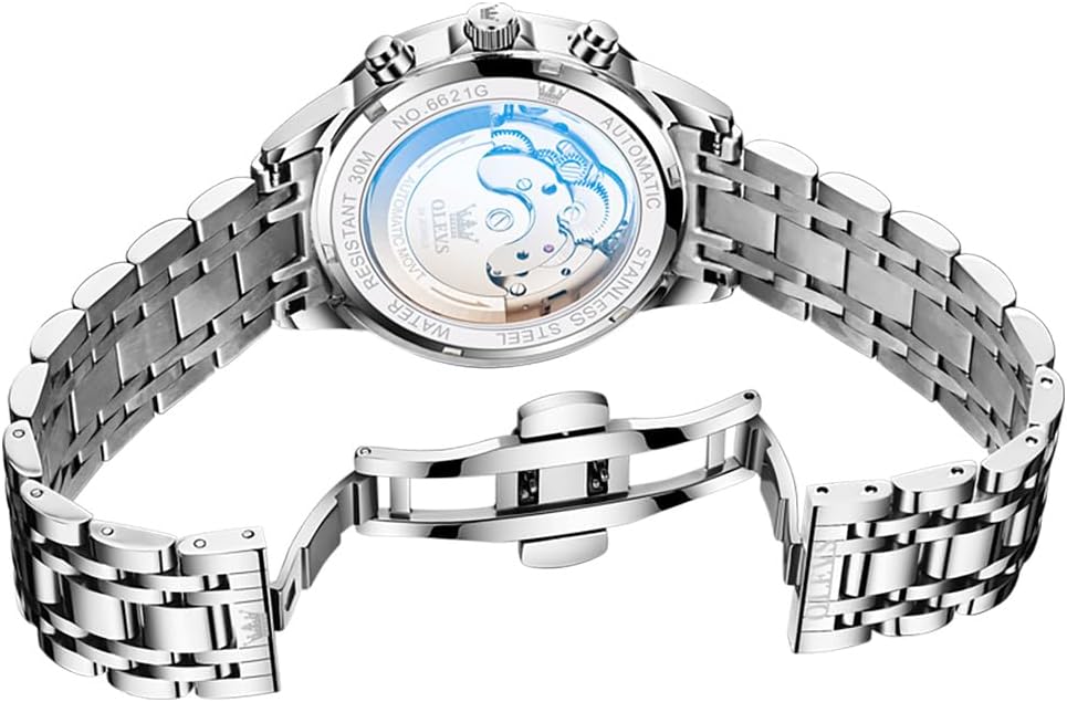 The OLEVS Men’s Automatic Mechanical Luxury Dress Watch stands as a refined expression of mechanical artistry and modern design. Built for men who value both form and function, this timepiece features a bold, large-face profile with a fully exposed skeleton dial that reveals the intricate dance of gears, springs, and the mesmerizing tourbillon at its core. Powered entirely by the natural motion of the wearer’s wrist, this self-winding automatic movement ensures consistent operation without the need for batteries or manual winding under regular use. The watch seamlessly blends traditional horological elements—such as the moon phase display and date calendar—with contemporary aesthetics, making it a versatile companion for professionals, collectors, and style-conscious individuals alike. Whether worn during important business meetings or elegant evening engagements, it delivers a commanding presence on the wrist while maintaining the precision and reliability expected of a mechanical timepiece.